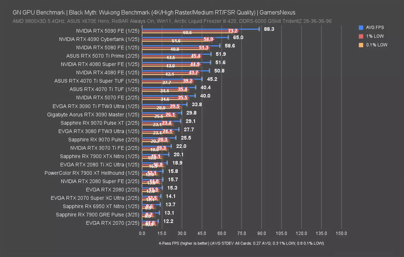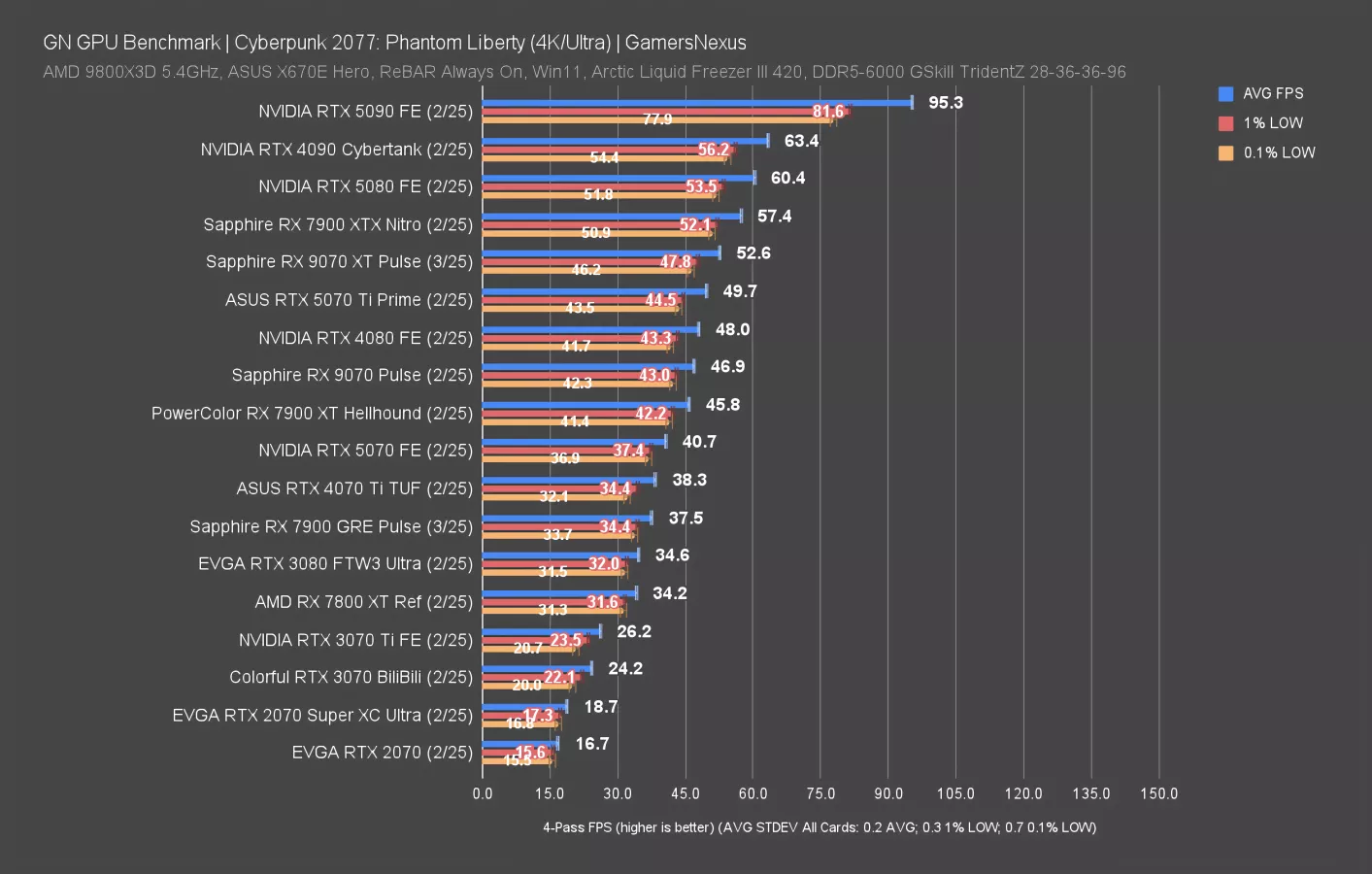 Against the 5070’s 83 FPS AVG, the 9070 leads by 15%. If the 5070 weren’t already in the grave, we’d pronounce its impending demise. We might want the 9070 to be a bit cheaper just to see that balance for the times it loses or is tied, but even without that, we can’t deny that AMD is putting up its best fight against NVIDIA in years.