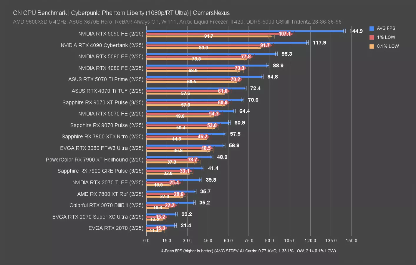 In Phantom Liberty at 1080p now, the 9070 landed at 148 FPS AVG, allowing the 7900 XT (watch our review) to maintain its slight lead. The improvement in the 9070 over the 5070 is now down to 7% from 15% at 4K originally. If we dropped it down to 360p, based on this trend, NVIDIA might actually pull ahead. Great. Just like they’ve wanted -- maybe that’s the push for DLSS.