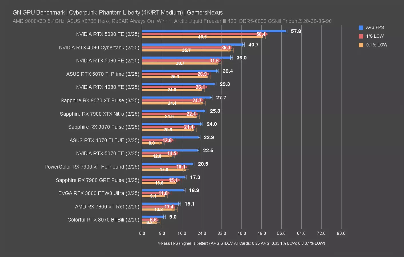 The results are thus far positive: We already knew that the 9070 XT outmatched the 5070 Ti, but now the 9070 is nearly tying the RTX 4080. That’s just embarrassing for NVIDIA’s last-gen mid-range-posed-as-a-flagship GPU as compared to a $550 card. The 9070 technically outperforms the 7900 XT as well, though is basically tied, and the lead over the 5070 is 15% again.