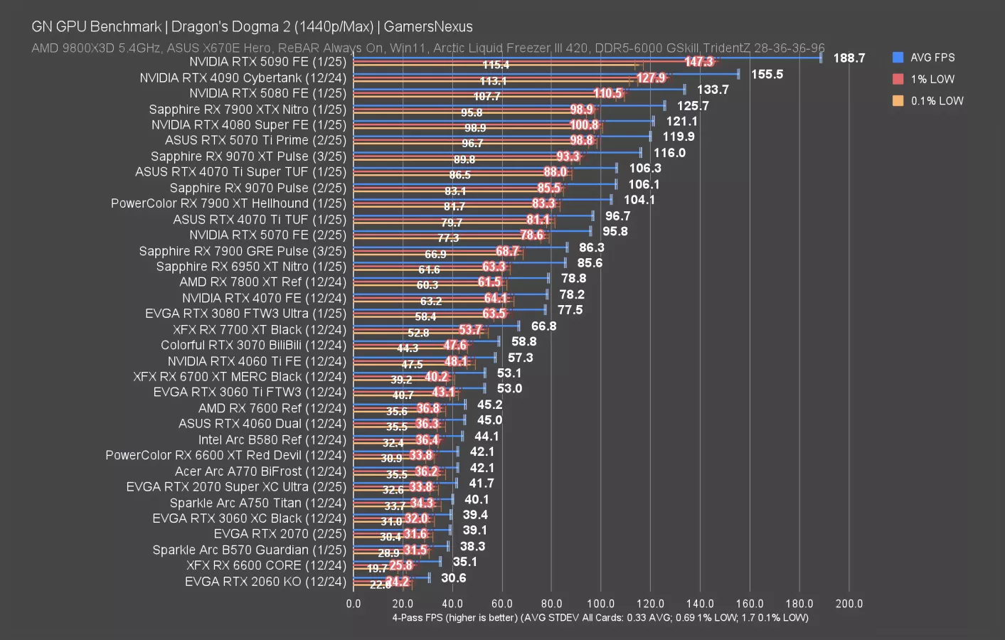 Against the 5070’s 152 FPS AVG, the 9070 runs 13% ahead. The 5070 really does look even more DOA than previously in some of these tests. If it were a dead horse, it’d be getting kicked right now.