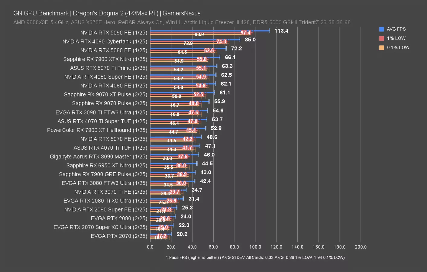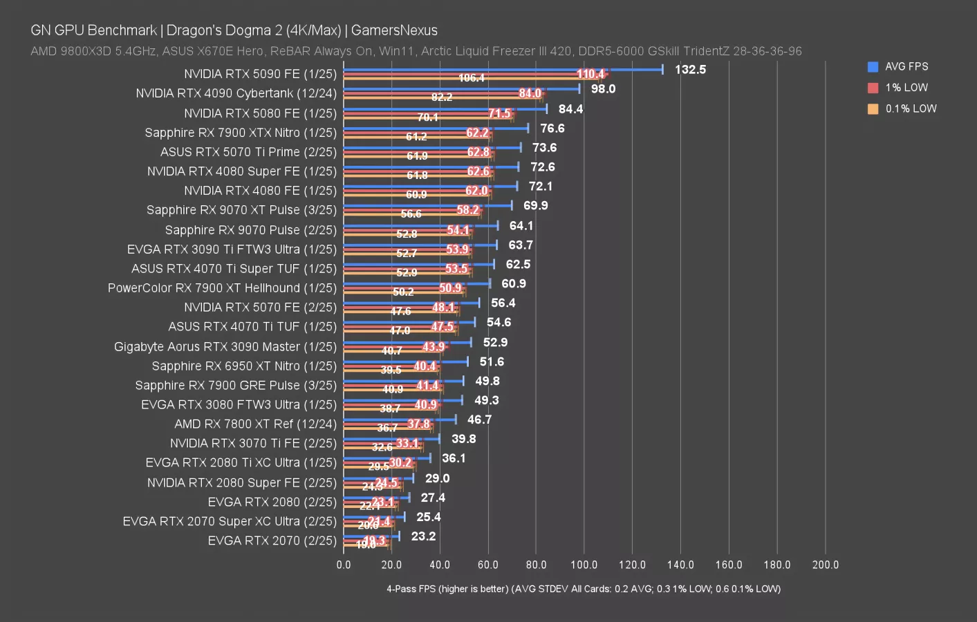 Dragon’s Dogma 2 with ray tracing is next, tested at 4K first. We measured the 9070 at 56 FPS AVG, giving the 9070 XT a lead of 9%. The 4080 isn’t much past that, so for as close as these cards are, they’re also very close to the 4080 and 4080 Super. The 5070 trails in this one, giving the 9070 a lead of 15%.