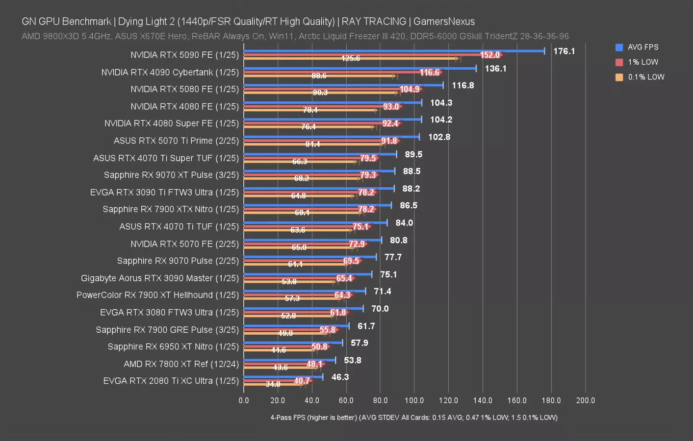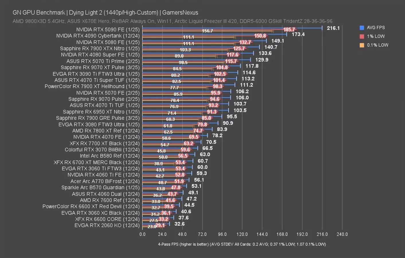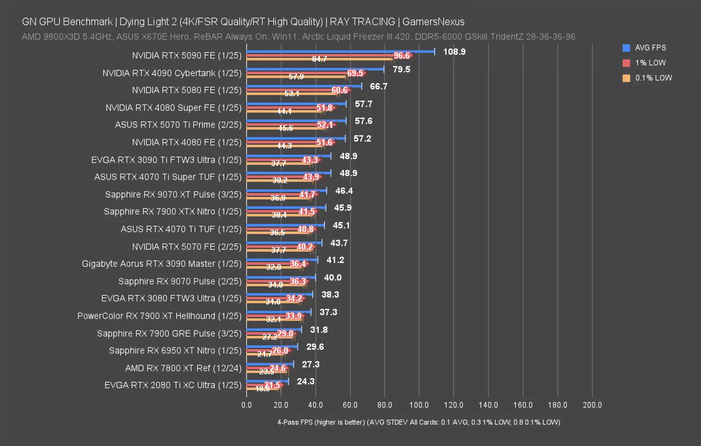 In Dying Light 2 at 4K, the RX 9070 ran at 56 FPS AVG and kept lows remarkably close by, at 50 and 41 -- but not in any more remarkable way than all of its neighbors. This game is just consistent.