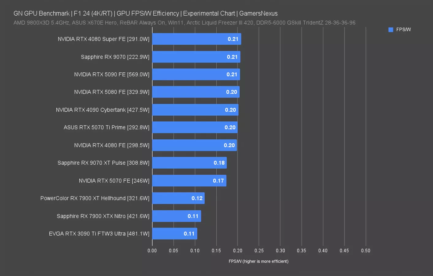 In F1 24 at 4K and with RT, AMD has exceptional performance. These are only showing two decimals, but more are processed for the bar width. The 9070 roughly tied with the 4080 Super and 5090 FE (beware of scalped prices) as the most efficient GPU in our test suite.