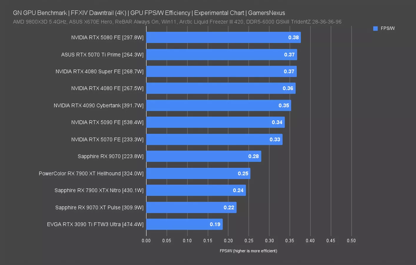 At 1080p but with the same settings and game, the 9070 again ends up just behind first place. It’s tied with the 5070 Ti and just behind the 0.64 result of the 5080 (read our review). The 9070 XT burns more power and, although its performance is better, the tradeoff favors the 9070 here. The 5070 ends up way down the ranks, at 0.55 here.
