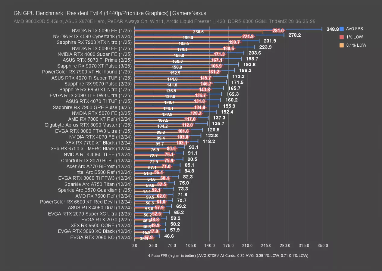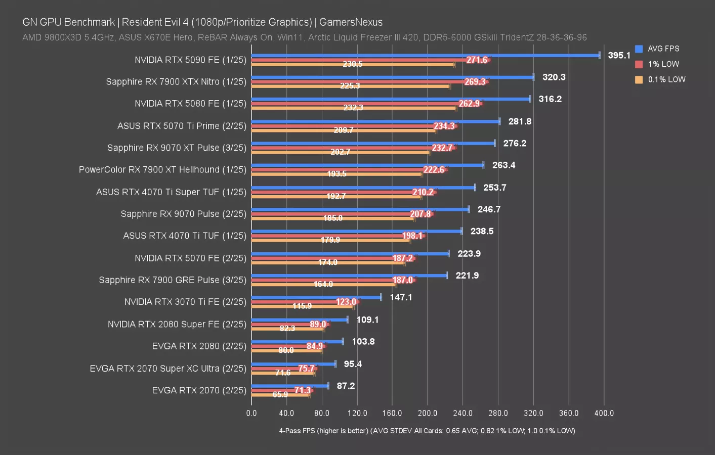 In Resident Evil 4 with ray tracing and at 4K upscaled, the 9070 held a 104 FPS AVG and outperformed the 4070 Ti Super and 5070. The boost over the 5070 is 14% here. The 9070 XT ran 12% higher framerate than the non-XT, with the 5070 Ti basically tied with that.