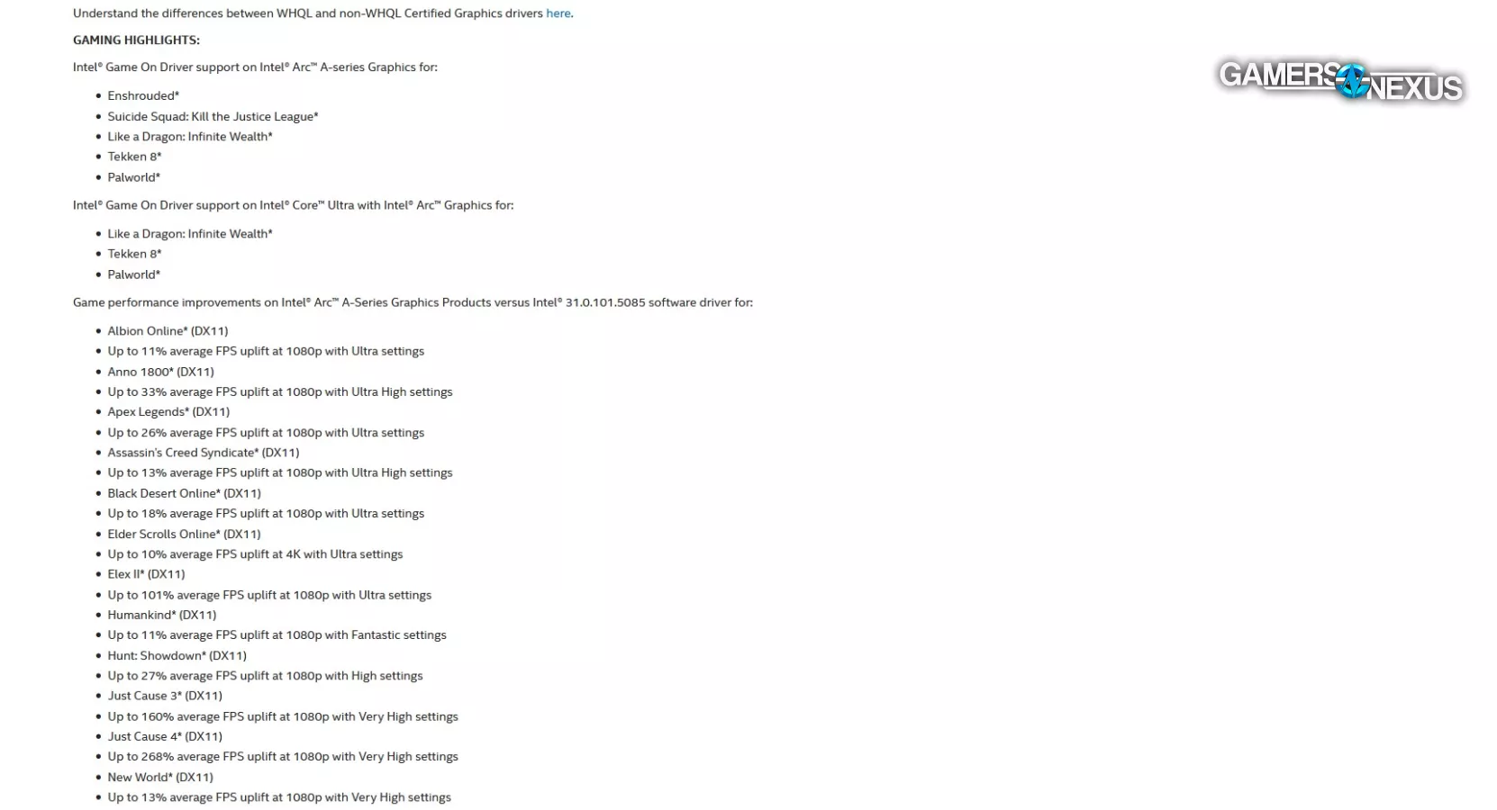 That has slowly been shifting. Today, we’re revisiting Intel Arc again -- now going on almost 2 years later -- to see how it’s improved from driver updates alone. There aren’t any hardware changes here, so Intel’s newly established positioning has been gained purely from driver and software updates. This huge list of patch notes we’re showing is just one of the two most recent drivers -- and Intel has published similarly sized updates for over a year now.