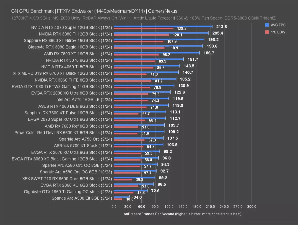 At 1440p, the Intel Arc cards fall in the ranks -- comparatively, they’re doing a lot better at 4K against competition. The A750 outperforms the RX 6600 XT by 5.3%, but the RX 7600 leads the A750 by 13%, up at 177 FPS AVG. The A770 also doesn’t scale as strongly here, roughly tying the RTX 4060 and falling behind the RX 7600.