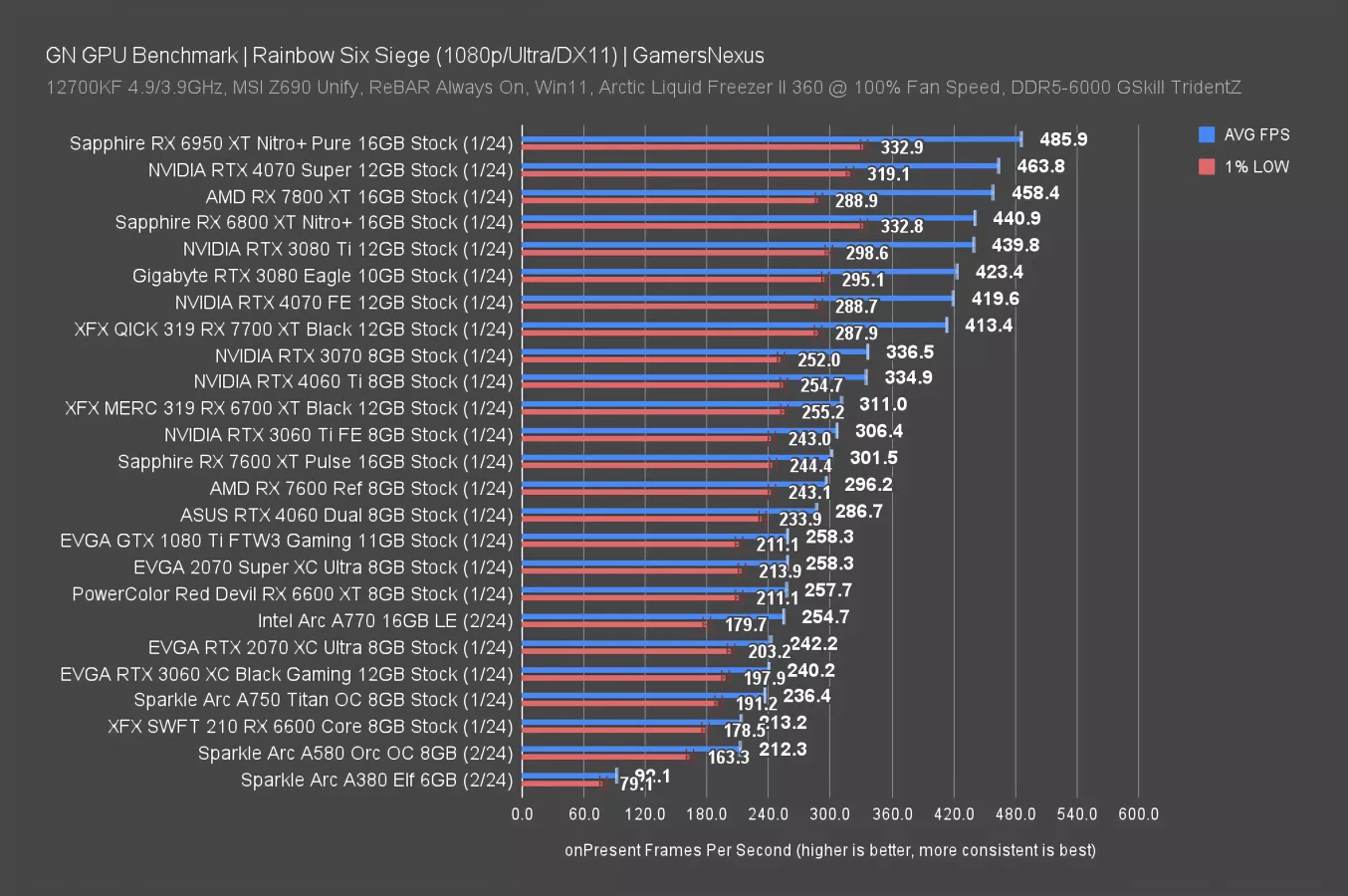 For the A580, we saw a 91 FPS AVG that ranked it between the RX 6600 (watch our review) -- currently still available for $190-$200 -- and RTX 2070 Super (watch our review). It’s not distant from the GOATed 1080 Ti (watch our review).