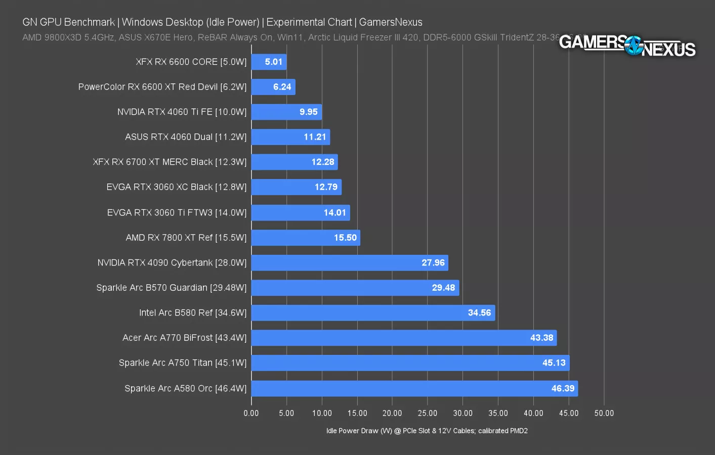 In idle testing, Intel Arc remains power hungry as compared to its competition. Using our test platform as configured for benchmarking, the B570 pulled about 30W idle. The B580 was around 35W. This is overall high.
