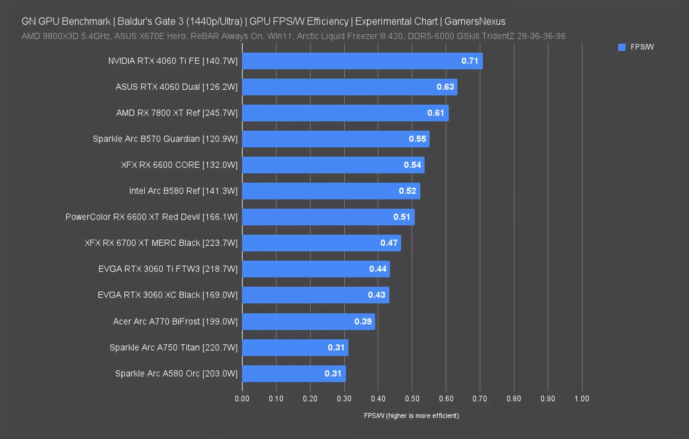 Baldur’s Gate 3 at 1440p shows FPS/W, meaning that higher framerate and lower power will create the most efficient result. Higher is better.