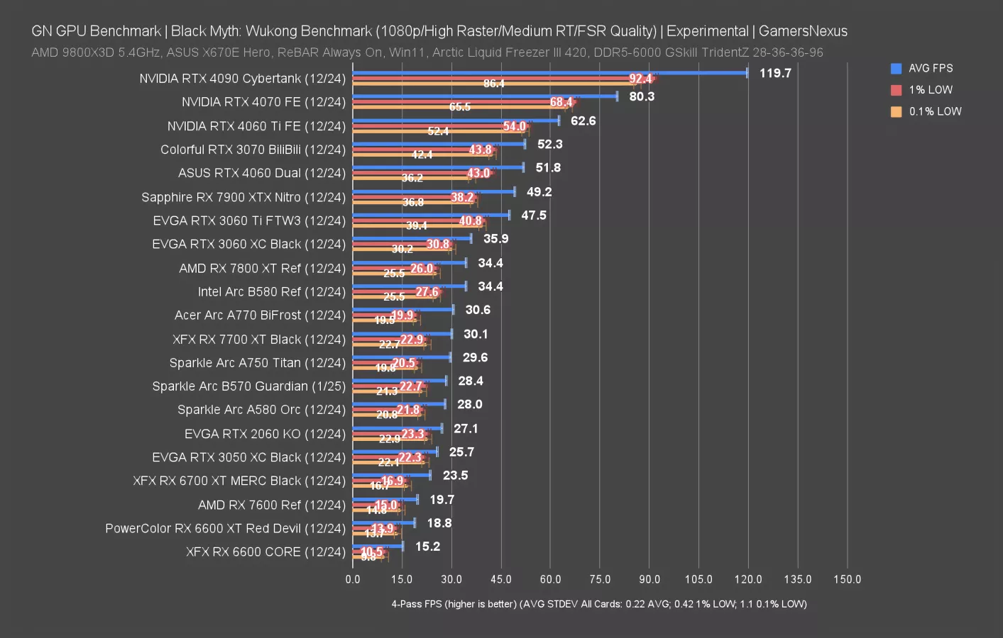 The RTX 4060 ran at 107.9 FPS AVG on the 9800X3D and 106.5 FPS AVG on the 12400. The RTX 4060 shows a top-to-bottom range of 1.3%, smaller than the observed difference on the B570. This slightly reconstructs the stack such that the B570 ends up tied or slightly under the RTX 4060 rather than ahead of it by 2.1%; however, the reduction puts the RTX 4060 on like-for-like hardware maximally 2% ahead. Between the two, they’re realistically about the same.