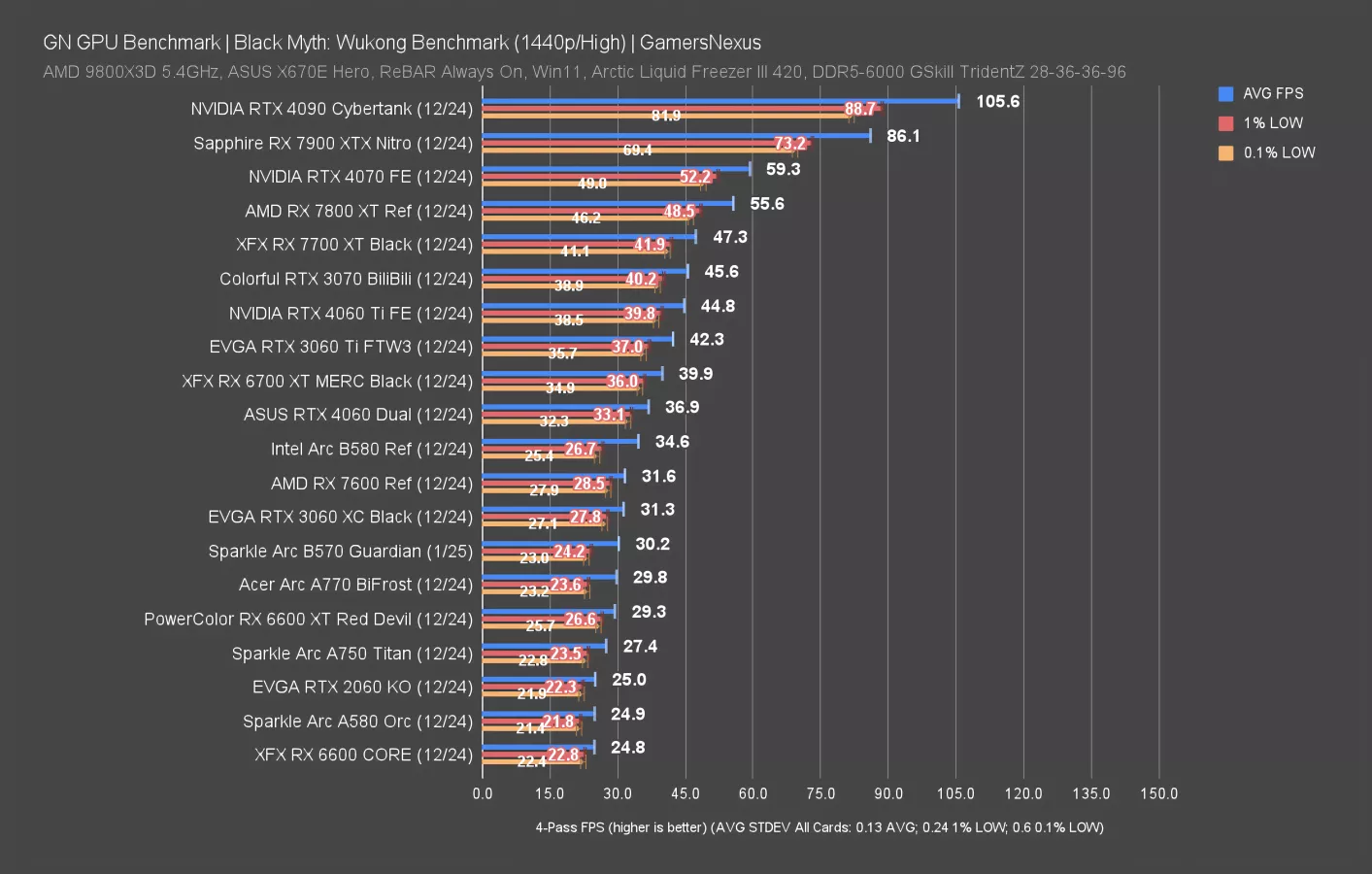 At 1080p, the B570 GPU ran at 47 FPS AVG, planting it between the A770 of last-gen and the RX 6600 XT. Against Alchemist, it’s clear that Battlemage is a huge improvement when considering the configuration size of the A770 GPU against the B570 GPU. Against itself, Intel has definitely improved in huge ways. Against competition, the RTX 4060 and RX 7600 both hold advantages at both the resolution and with the game.