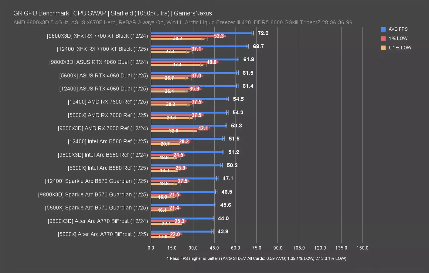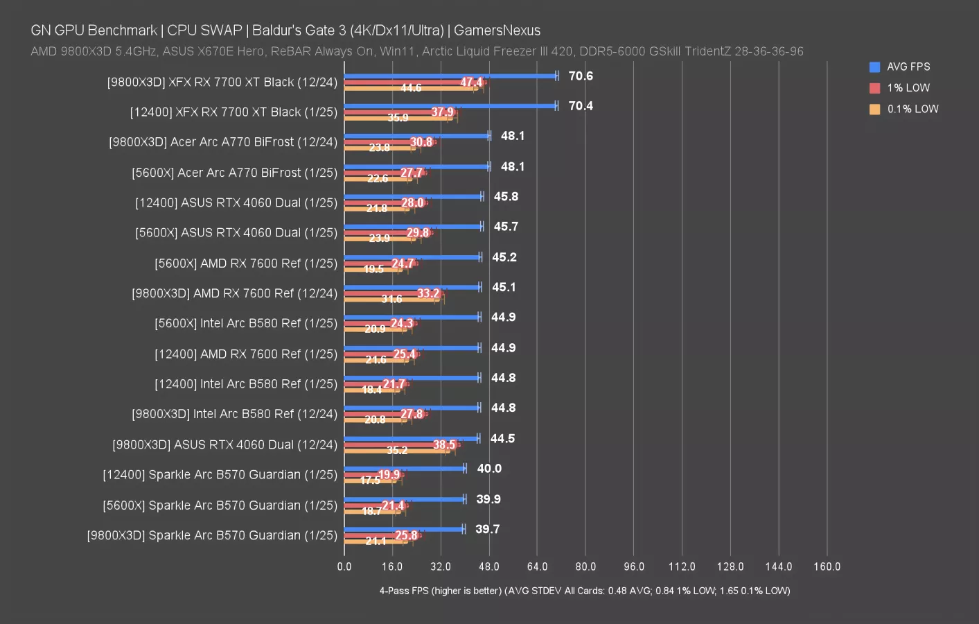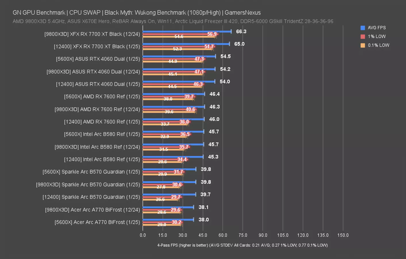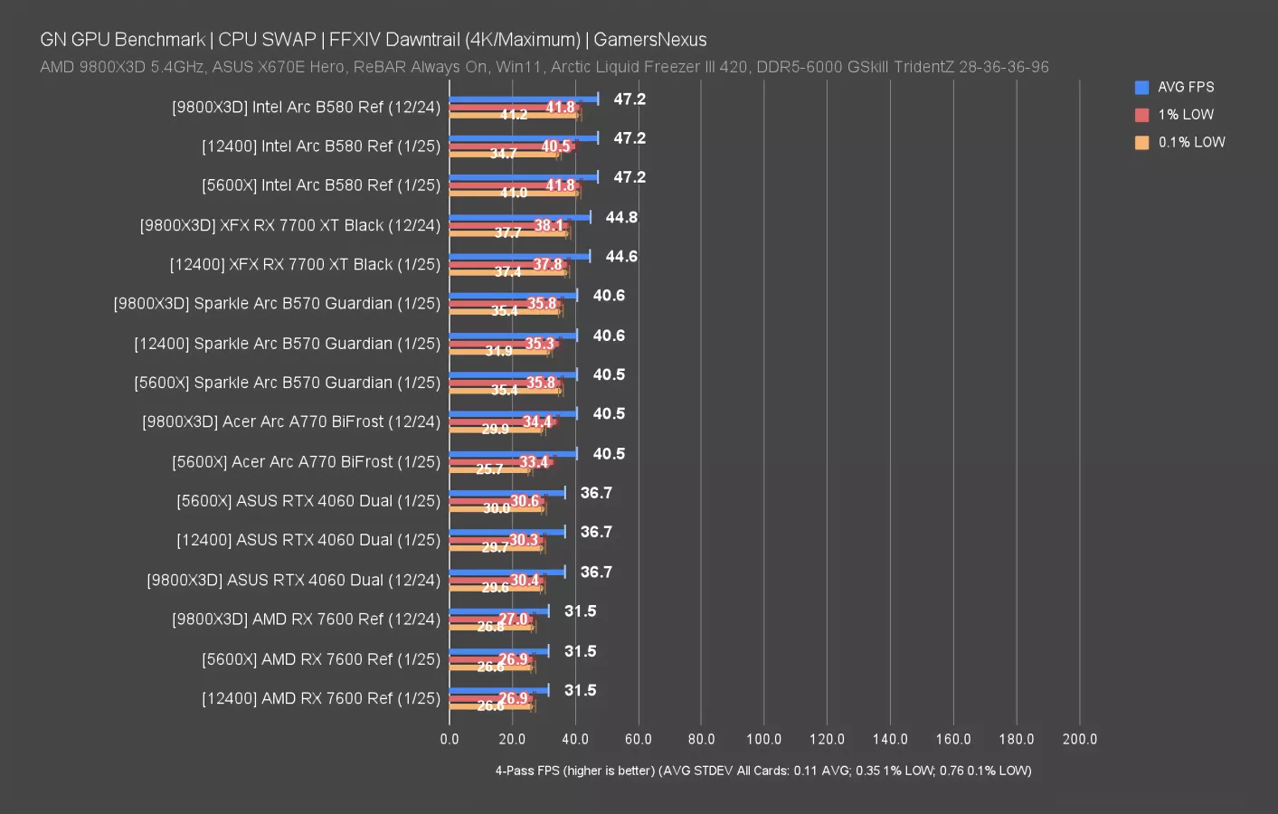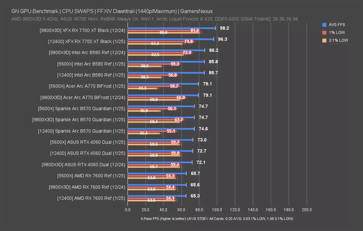 The numbers do not change in any meaningful way. The 7700 XT is the same on both, the 4060 is the same on all 3, the 7600 is the same on all 3 (with the exception of reduced lows on the 12400), the B580 is the same on all 3 and lows are within variance run-to-run. The B570 is the same on all 3, with lows within the wider variance at the low-end. The A770 is the same on both.