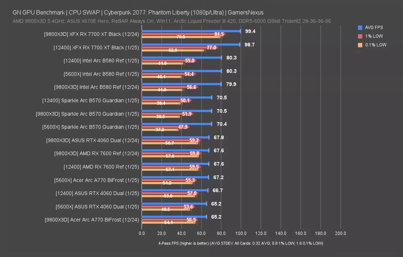 This is Cyberpunk at 1080p/Ultra. We’ll go through it fast: The results do not change CPU-to-CPU. The only differences are on the RTX 4060, where we see worse lows on the lower-end CPUs, the A770, where we see a very slightly lower average, and the 7700 XT, where we see a change in 0.1% lows. The B580 and B570 do not exhibit a change. In fact, realistically, the CPU change does not affect any of these results with regard to how we do a standard review. They are the same. This is GPU-bound, so that’s what you’d expect. Some of the internet has lost the plot and think “Arc bad at 1080p,” but it’s not that simple. It depends on the GPU load and the game.
