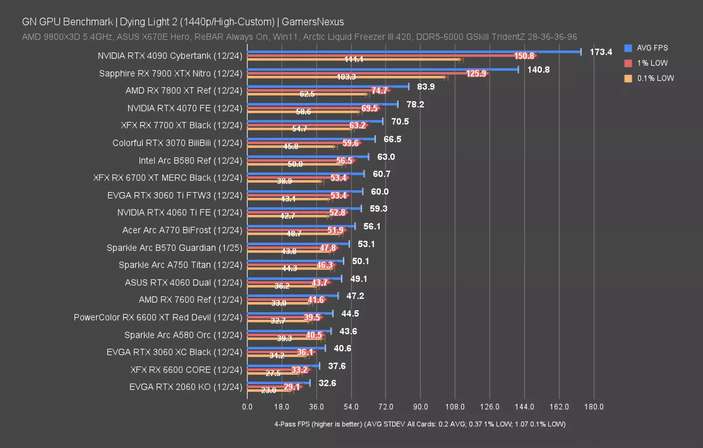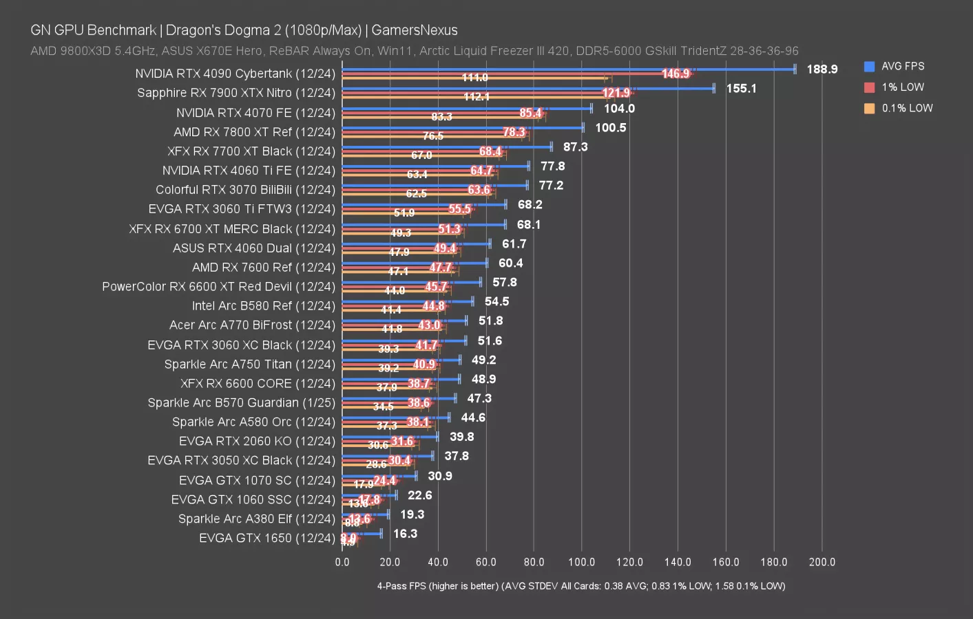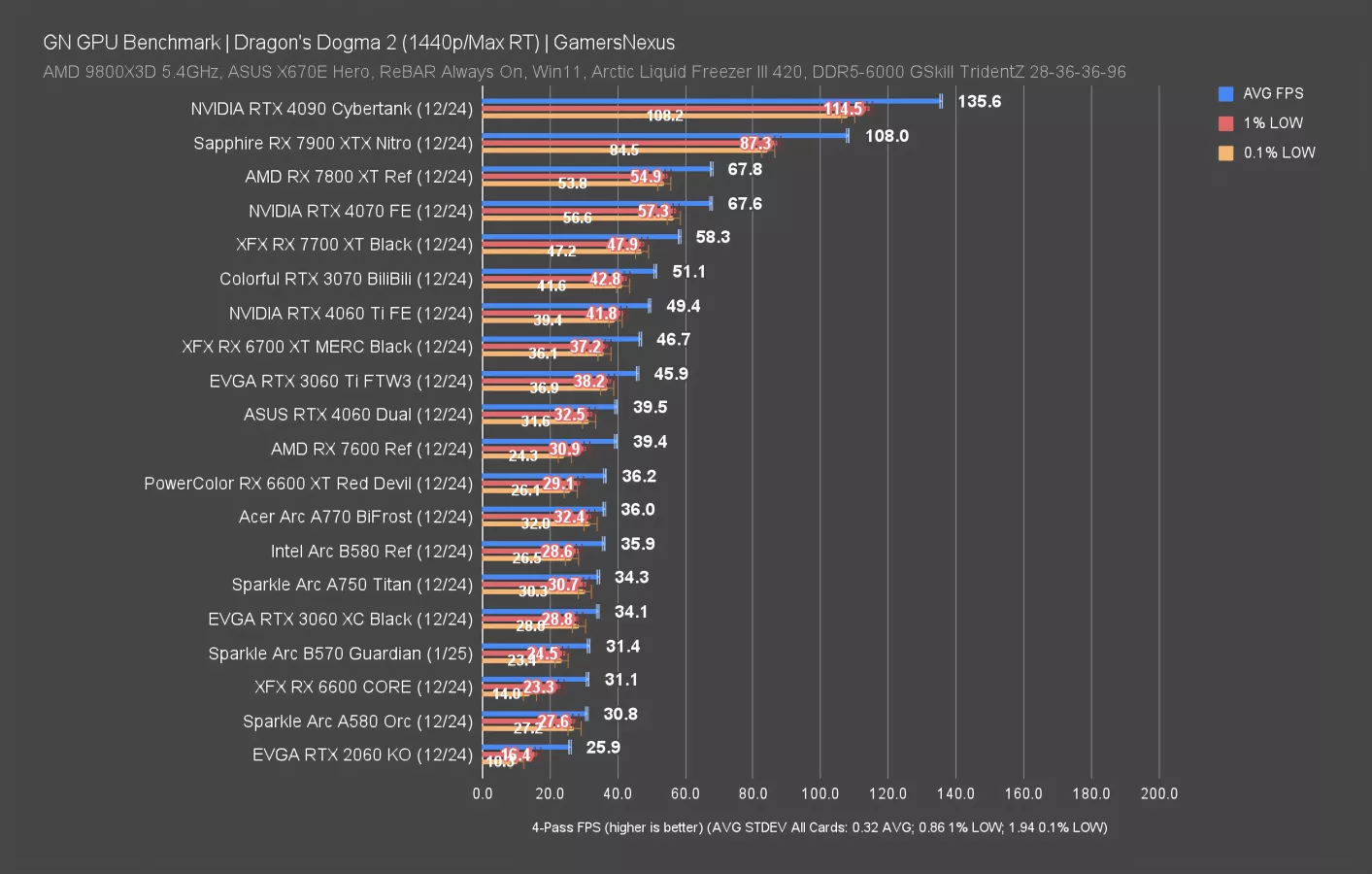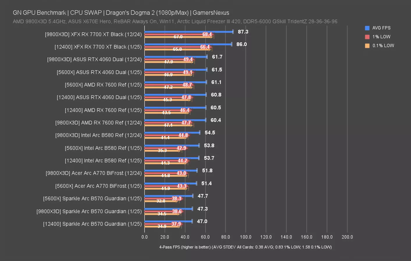 Dragon’s Dogma 2 is up next, first at 1440p/Max without RT. In this test, the B580 sticks to a 15% lead over the B570, so that’s consistent. The RTX 4060 leads the B580 and the B570 alike, with the RX 7600 about tied with the RTX 4060 and within run-to-run variance. The B570 is not particularly strong here. It’s about the same as the 3060 and outperforms the RX 6600. The price is noteworthy, although the B580 is overall more competitive in raw performance. In the least, lows are comparable in this test to non-Intel parts.