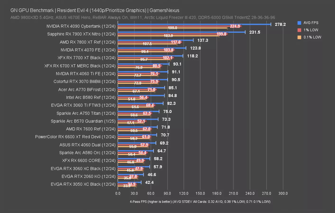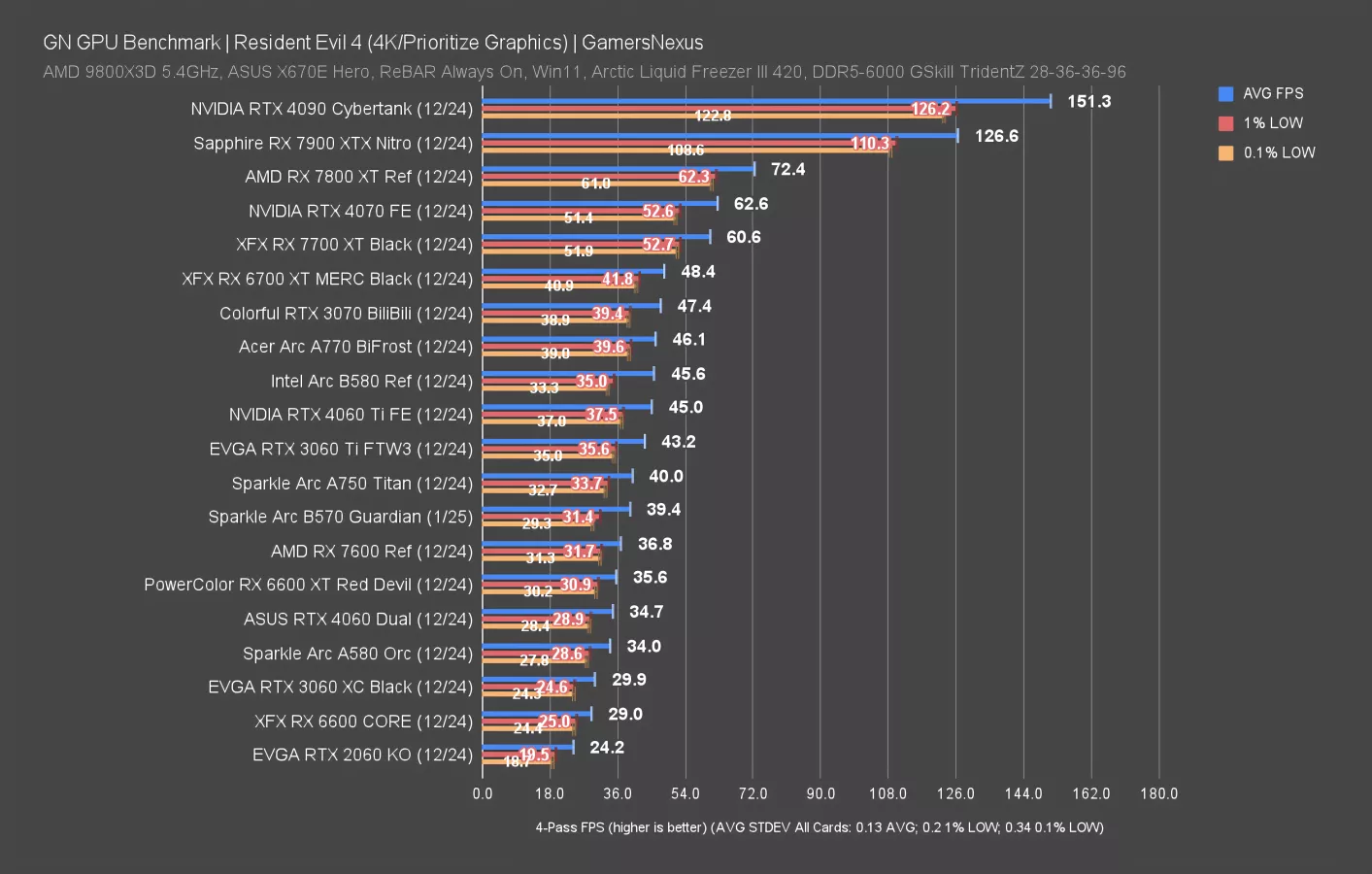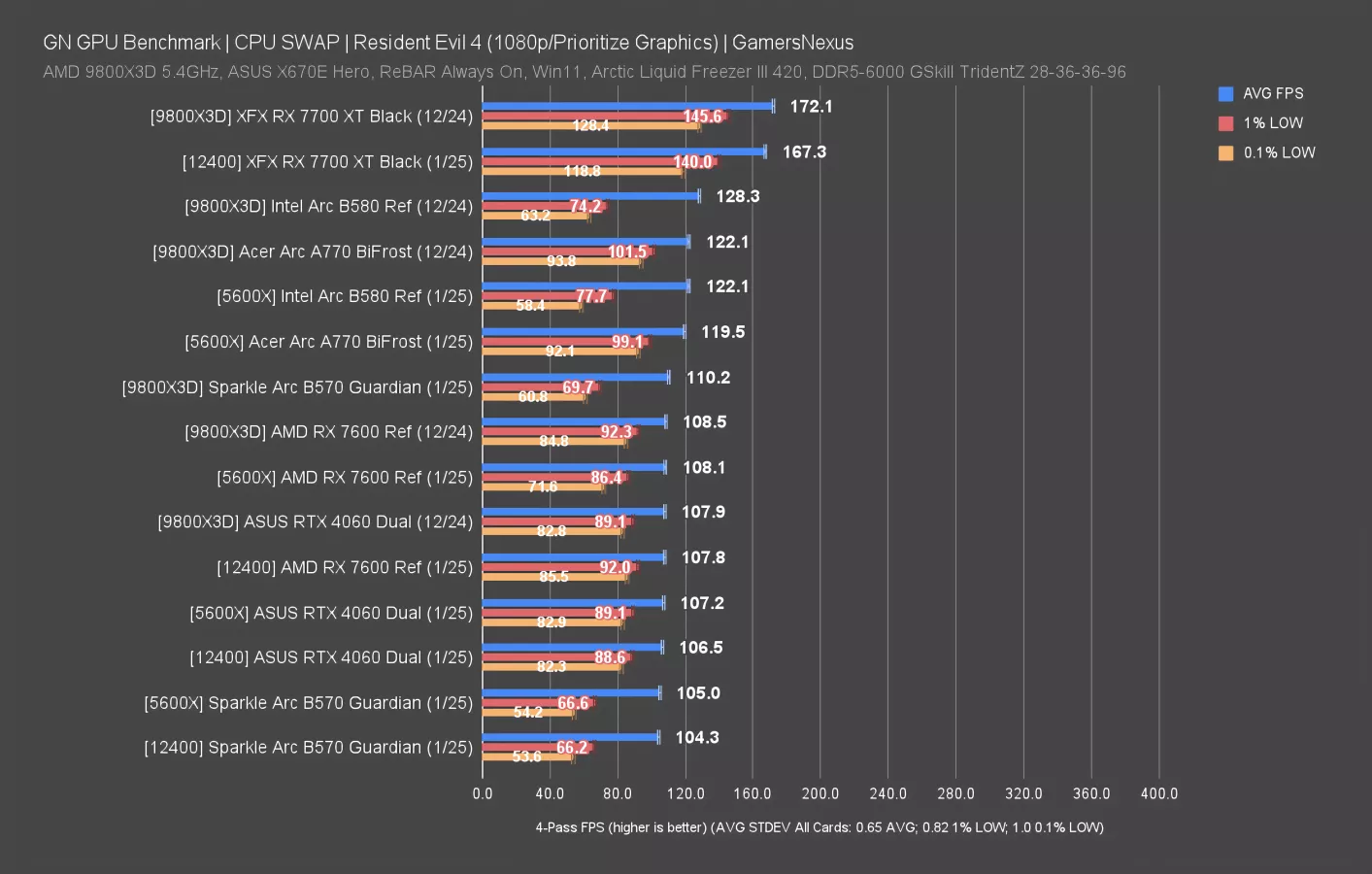 Resident Evil 4 at 4K was one of the B580’s strongest titles. In this test, the B580 marginally outperformed the RTX 4060 Ti (watch our review) in averages, with the 0.1% lows close enough to be comparable given wider margins. The B580 at 46 FPS AVG leads the B570’s 40 FPS AVG by about 16%, aligning with some of the other 4K results. The B570 ends up outperforming the RX 7600 by 7% and the RTX 4060 by 14%, which is an incredible lead for the B570 when fully GPU-bound. Considering the RTX 4060’s price, this is a big lead for Intel.