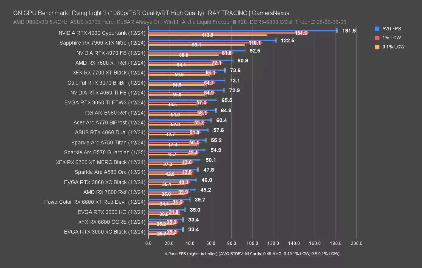Dying Light 2 with RT is up now. At 1080p, the B570 ran at 55 FPS AVG and held proportional lows, which is what we want. These results have it close enough to the RTX 4060 that they’re experientially the same. The RTX 4060 has a lead of 5% over the B570, with the B580 leading both at 65 FPS AVG. The B580’s average framerate is 18% higher than the B570 in a notable distinction. The RX 7600 lands below all of these, closer to the RTX 3060 and below the A580. Intel’s Arc has overall strong RT performance in this title.