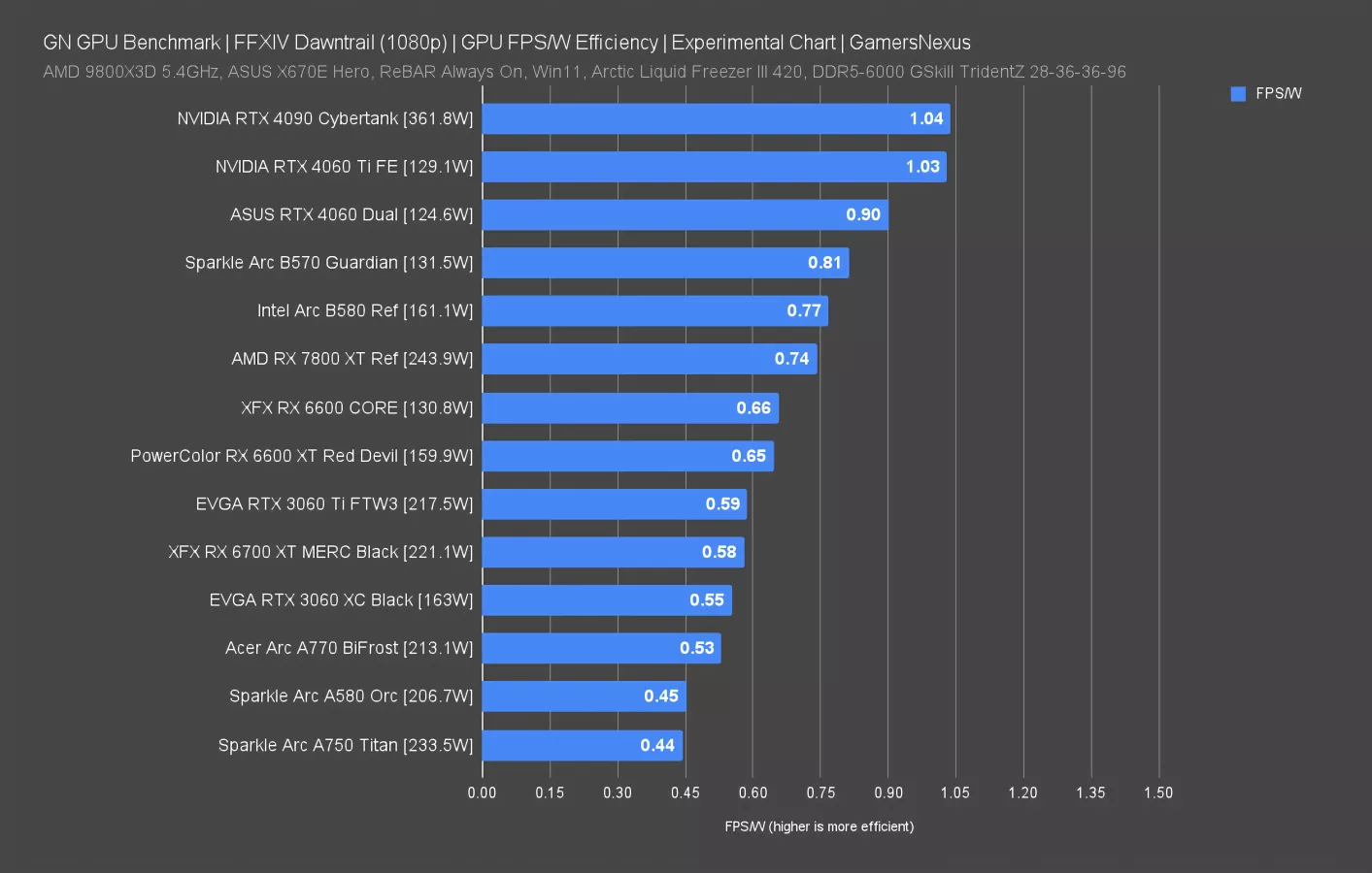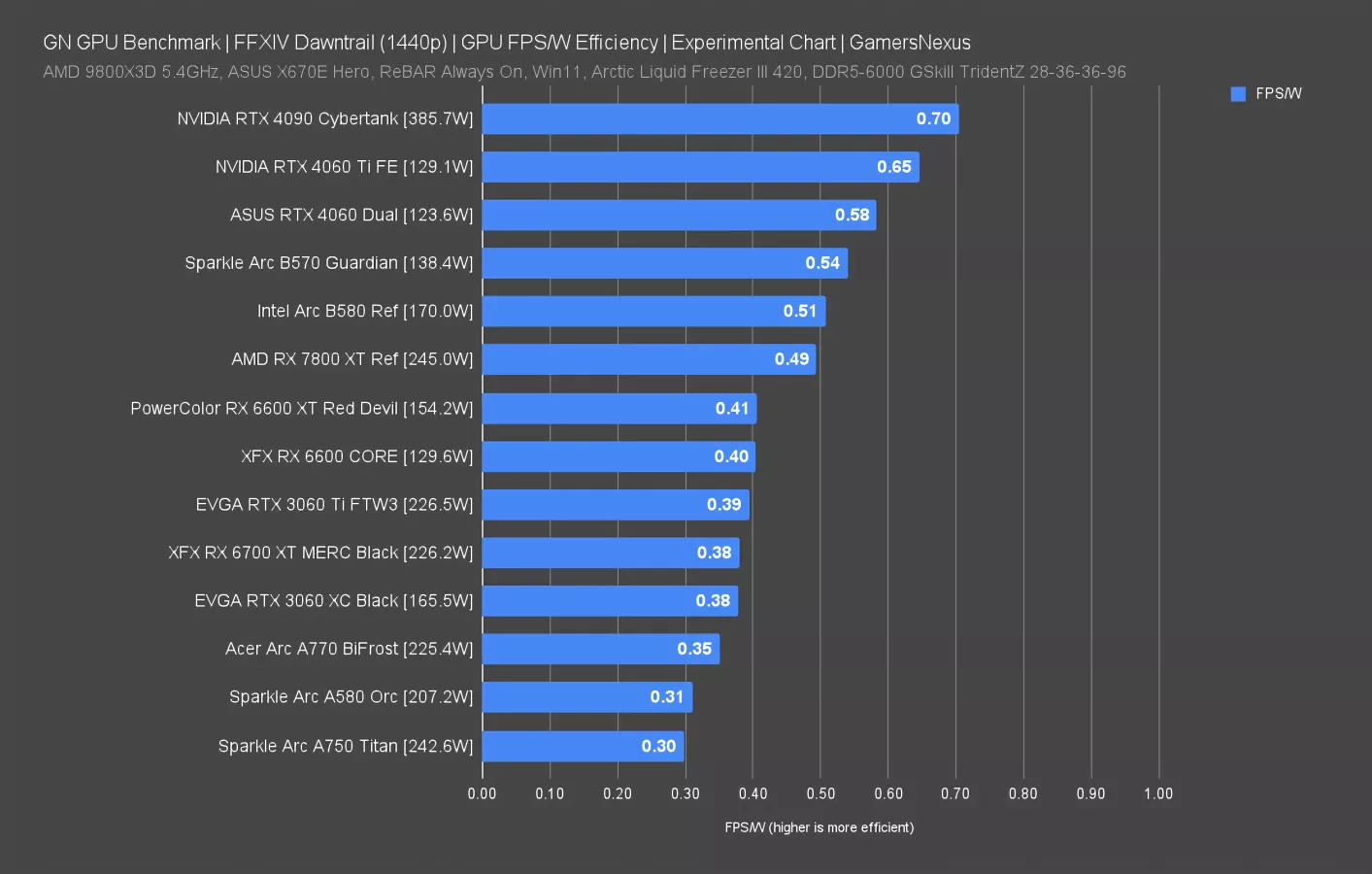 Final Fantasy 14 at 1440p is an OK showing for the B570. At 0.54 FPS/W, it’s near the RTX 4060 and better than the B580. This is an OK spot to be in for Intel.