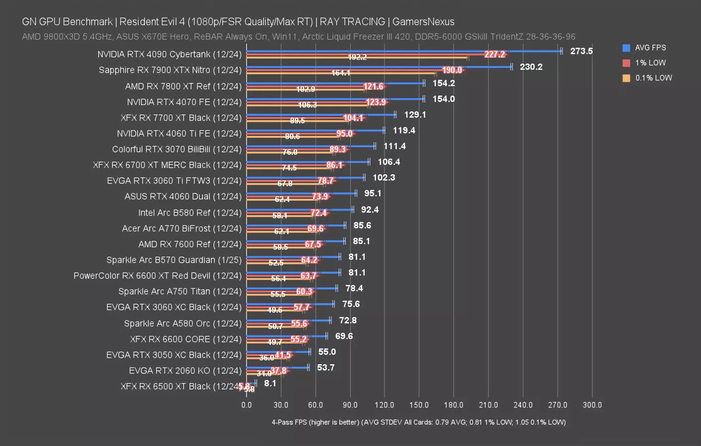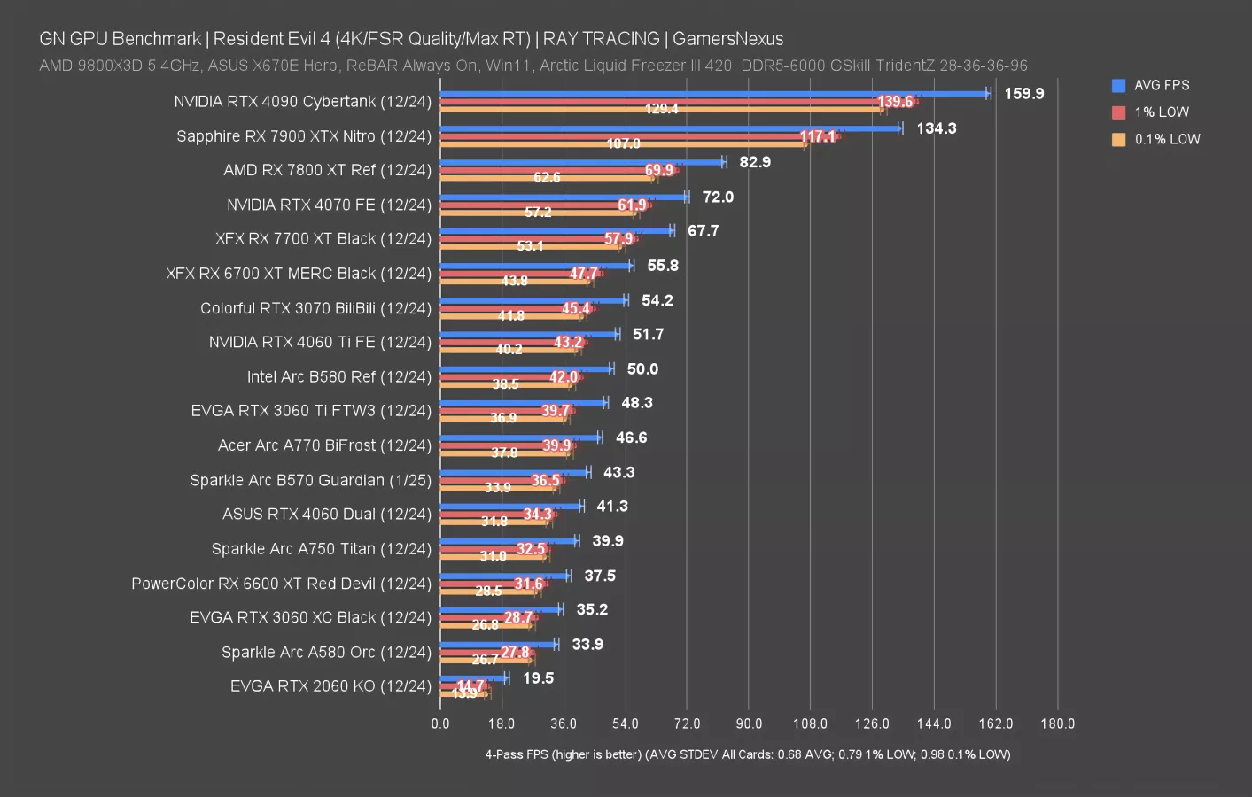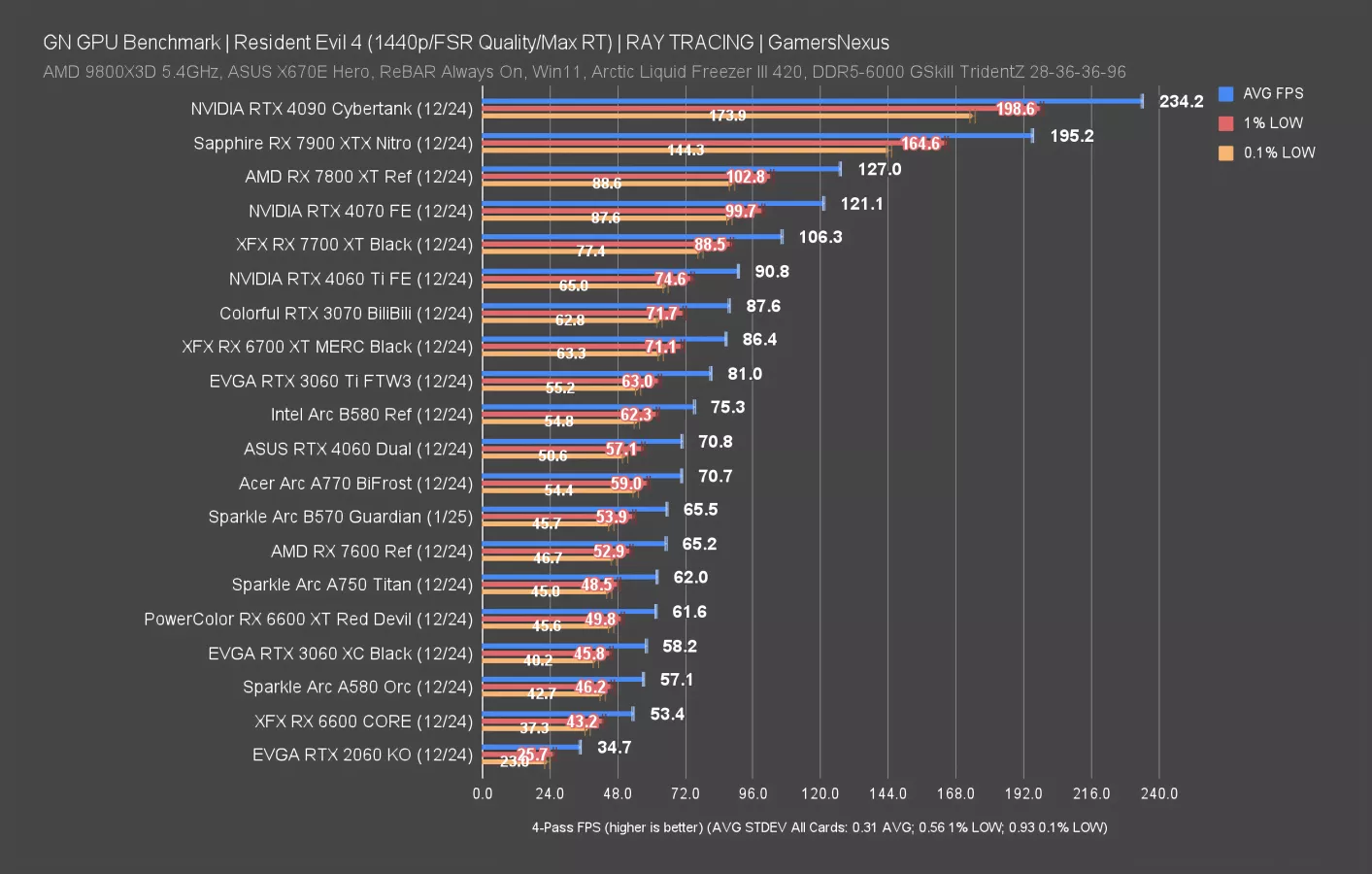 In Resident Evil 4 at 4K with RT and FSR, the B570 ran at 43 FPS AVG and with lows overall acceptable for its average. That has it ahead of the RTX 4060 in a strong showing for Intel. The B580 leads the B570 by 16%, which puts it functionally identical in performance to the RTX 4060 Ti.