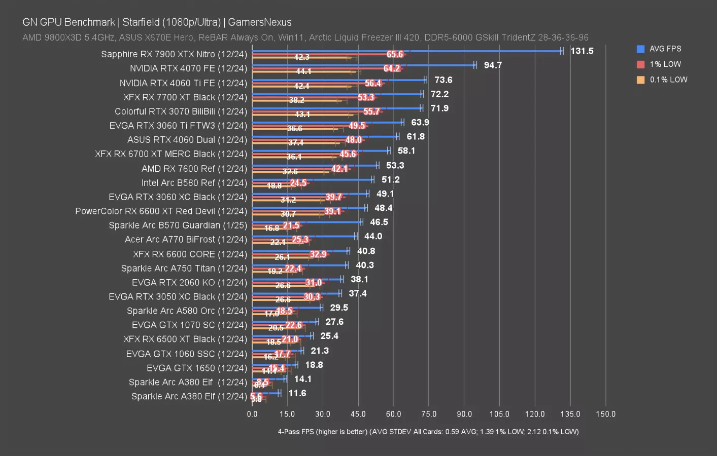 The B580 keeps its 16% lead over the B570 in this test, with both outdoing the RTX 4060. The RTX 4060 Ti even struggles in this, also suffering from inconsistent run-to-run variance and low performance for 0.1%. AMD has problems of its own, mostly just that it’s unable to compete in this test. The RX 7600 is down under 30 FPS AVG. At this price point, Battlemage is actually the best in this specific test and setup.