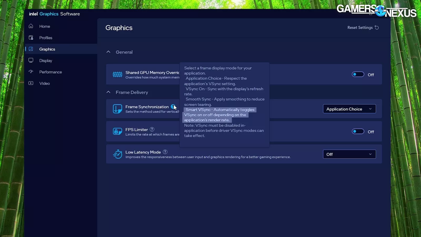 Intel’s inconsistency comes back into play with Smart VSync, which is intended to only turn on when the game’s frame rate exceeds the monitor’s refresh rate. It worked reliably when changing the setting prior to launching the game, but only worked one single time when we changed it while the game was still running; after that, it no longer functioned in this order or way, contributing to the overall confusion caused by Intel’s inconsistent driver behavior.