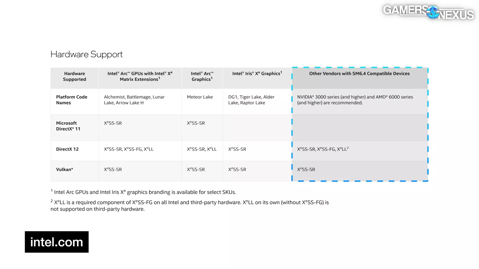 Also notable is that Intel recently opened up the possibility for NVIDIA and AMD GPUs to officially support XeSS Super Resolution and Frame Generation, aka XeSS-SR-FG, which is nearly a whole alphabet. Intel did this by publishing its XeSS 2.1 SDK. The only requirement is support for Shader Model 6.4, which applies to NVIDIA’s 3000 series onward and AMD’s 6000 series onward. In the time since, Intel has announced XeSS3, which we detailed in our Xe3 architecture article, which talks about their version of MFG.