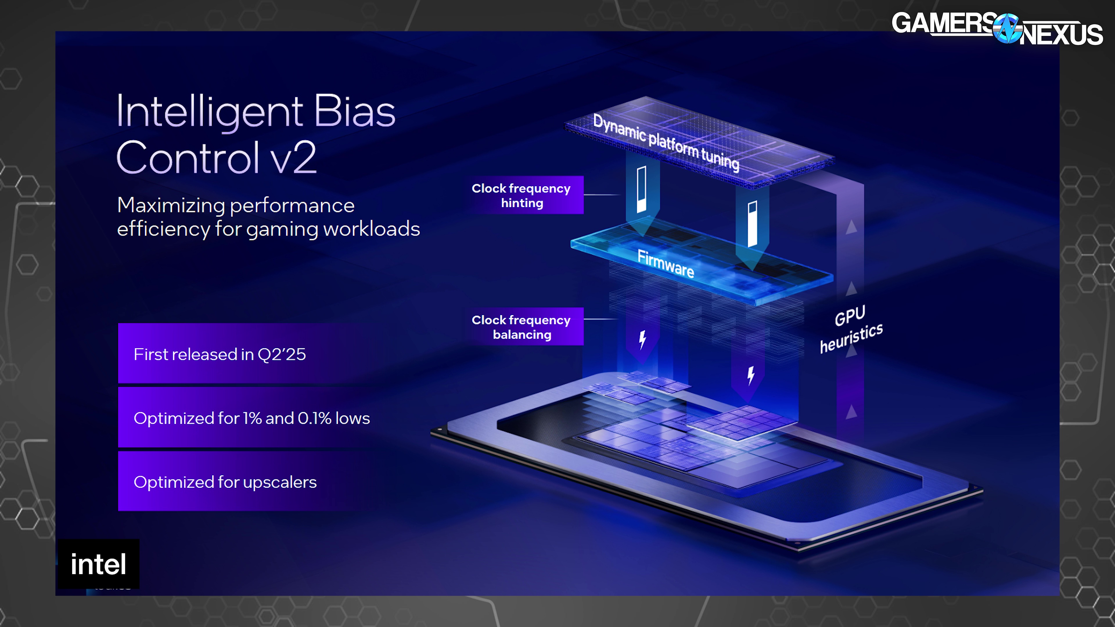 “Intelligent Bias Control v2” took GPU heuristics and utilization metrics to then inform thread scheduling and resource assignment at the operating system-level. Intel had previously marketed improvements to 1% and 0.1% low metrics via better frame interval pacing as a result of this change.