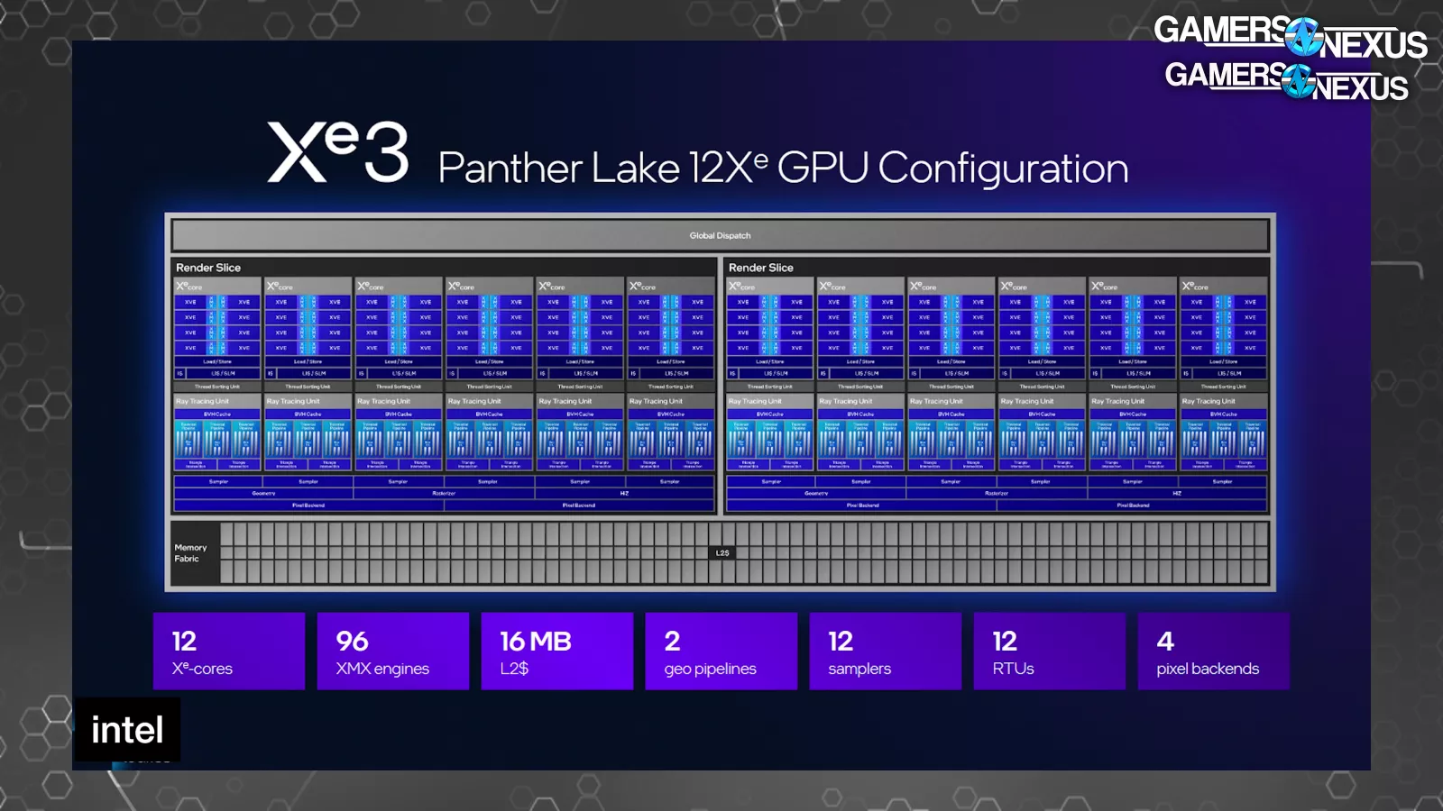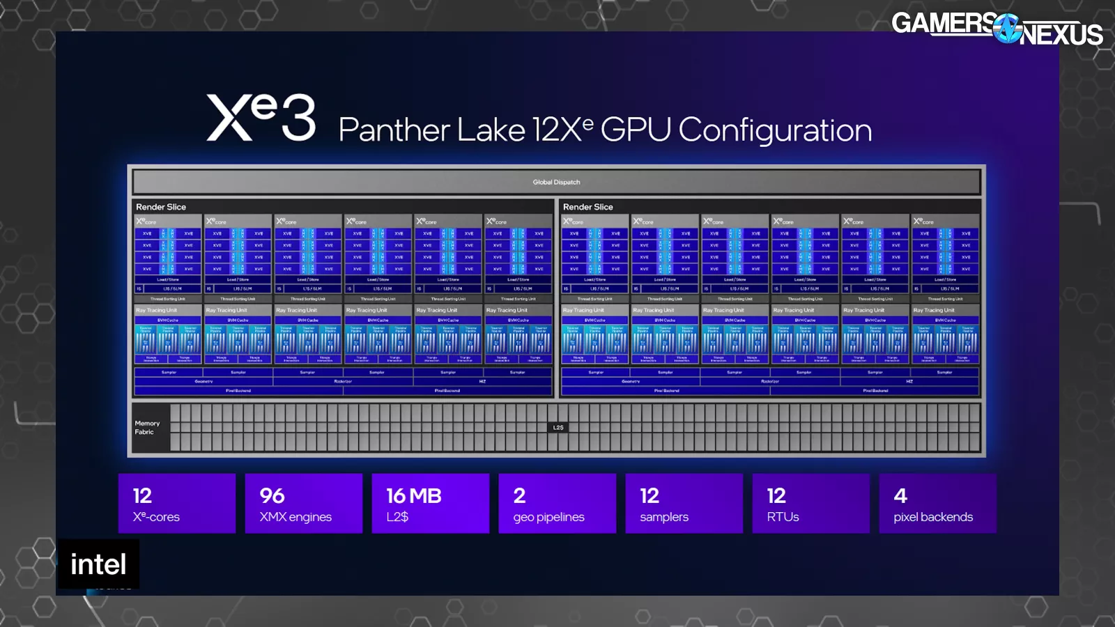 Time to get into block diagrams for how the new Panther Lake Xe3 block is constructed. This shows a 12 Xe-core configuration as the maximum size announced for mobile, with this configuration carrying 16MB of L2 cache, 2 geometry pipelines, 12 samplers, and 4 pixel backends. The L2 cache is noteworthy here.