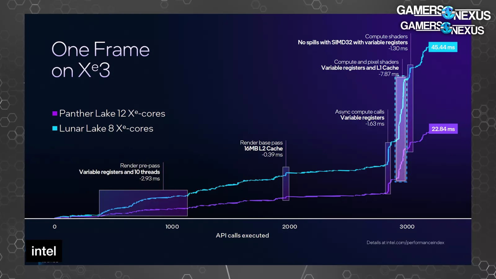 Of note, Intel shows an 8ms reduction to Xe3 with the compute and pixel shader section toward the end, assigning some of that uplift to the change to the variable registers and L1 cache size increase. We can also see that, according to Intel, the L2 benefits the render base pass with a 0.39ms improvement, preceded by the move to 10 threads (and variable registers) providing a 2.93ms improvement in the pre-pass.