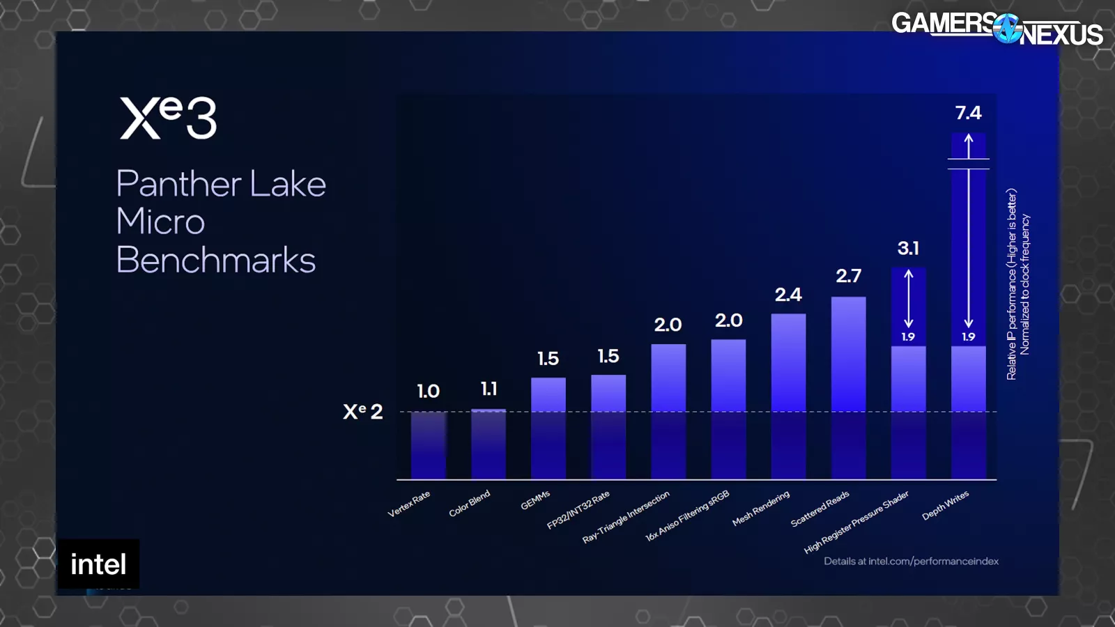 In Xe3 for “depth writes,” Intel says it saw a 7.4x relative performance improvement normalized to clock frequency. We’re not certain, but our understanding is that this is not isolated for configuration size. This means that this isn’t a perfect comparison since the Xe core count is different between Xe2 and Xe3 in these tests. This 7.4x improvement outstrips the change in configuration size, though.