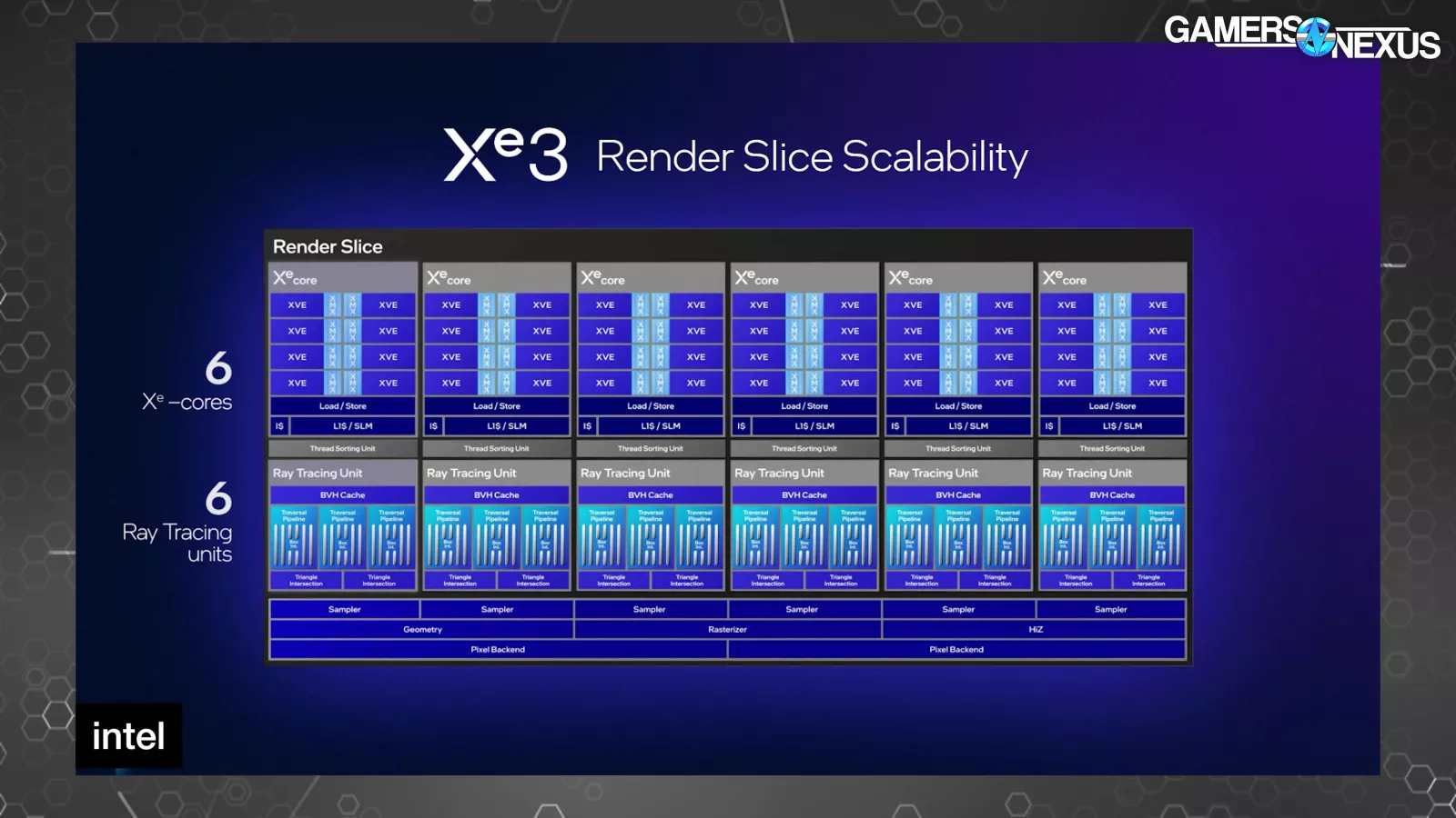 This is the new Xe3 render slice. A render slice is Intel’s terminology that defines a block on the GPU containing Xe cores. For reference, the Battlemage B580 with Xe2 has 20 Xe cores on 5 render slices, so each slice is just one part of the total GPU.