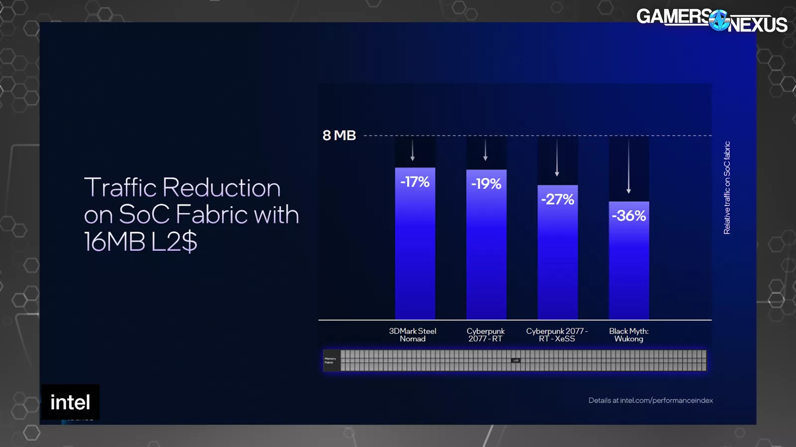 Looking at Intel’s first-party results, it presents the improvement in the form of relative traffic on the SoC fabric (in the vertical axis) against a baseline 8MB L2 cache. Cyberpunk with RT showed a 19% reduction, Black Myth rasterized showed a 36% reduction, and the rasterized Steel Nomad test showed a 17% reduction.