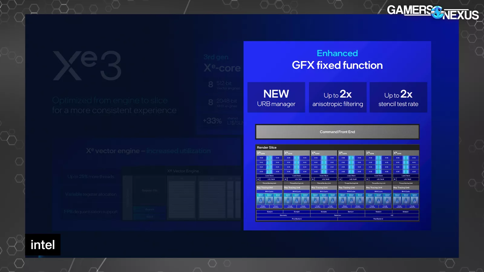 Intel also highlighted a new URB manager as part of its fixed function enhancements, which is also where we find the anisotropic filtering uplift. Petersen stated this, “We also now have a new URB manager, which allows partial updates versus flushing the whole thing. Our URB is a structure where we pass results between our units inside of our GPU. It used to be somewhat of a serializing point; now we can actually use that partially without flushing each complex.”