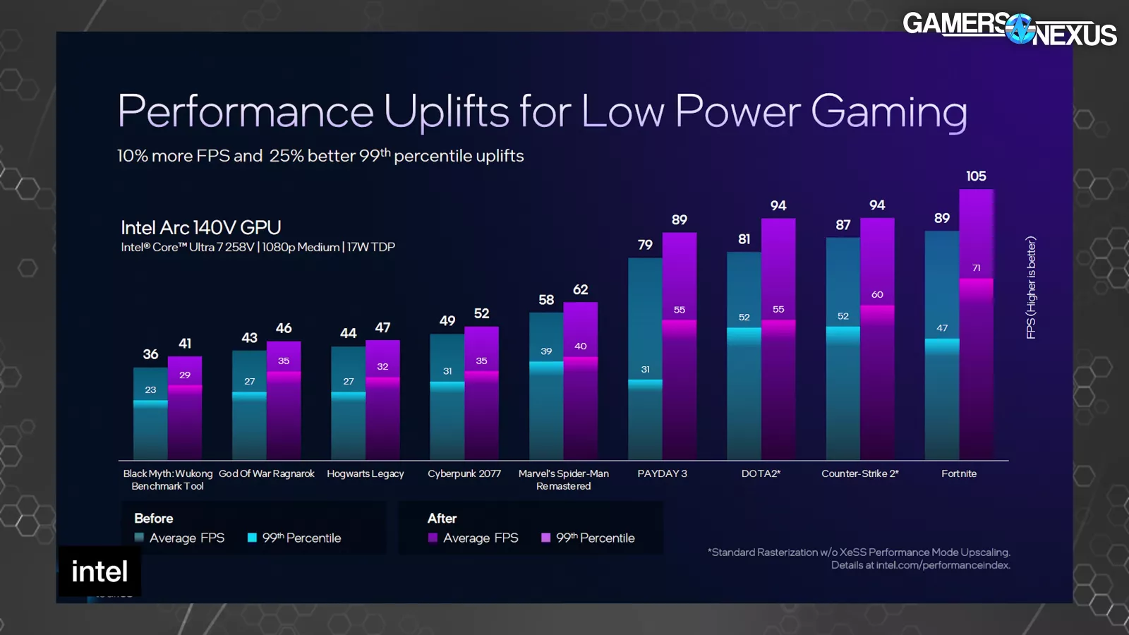 MFG represented on benchmark charts has been a major and ongoing controversy and misrepresentation of performance on NVIDIA’s side of things. Intel committed to relying on base raster performance without frame generation as the baseline for performance and said that, when it publishes numbers including upscaling or frame gen, those will be provided as supplemental to the base metric. We think this is a better balance of promoting the capability without totally misrepresenting the reality.