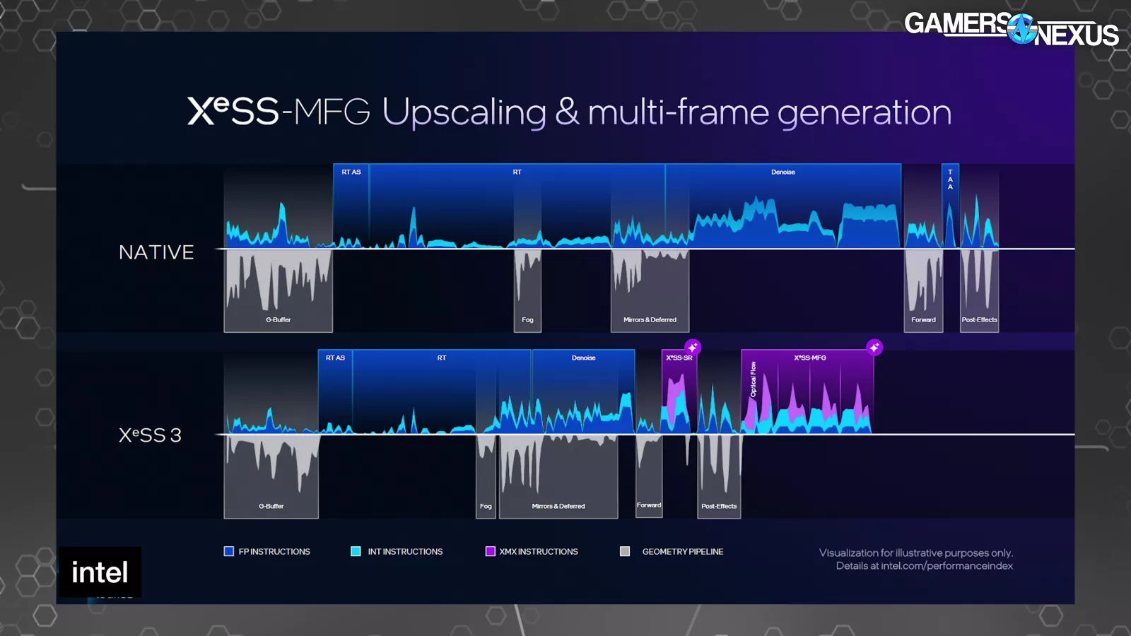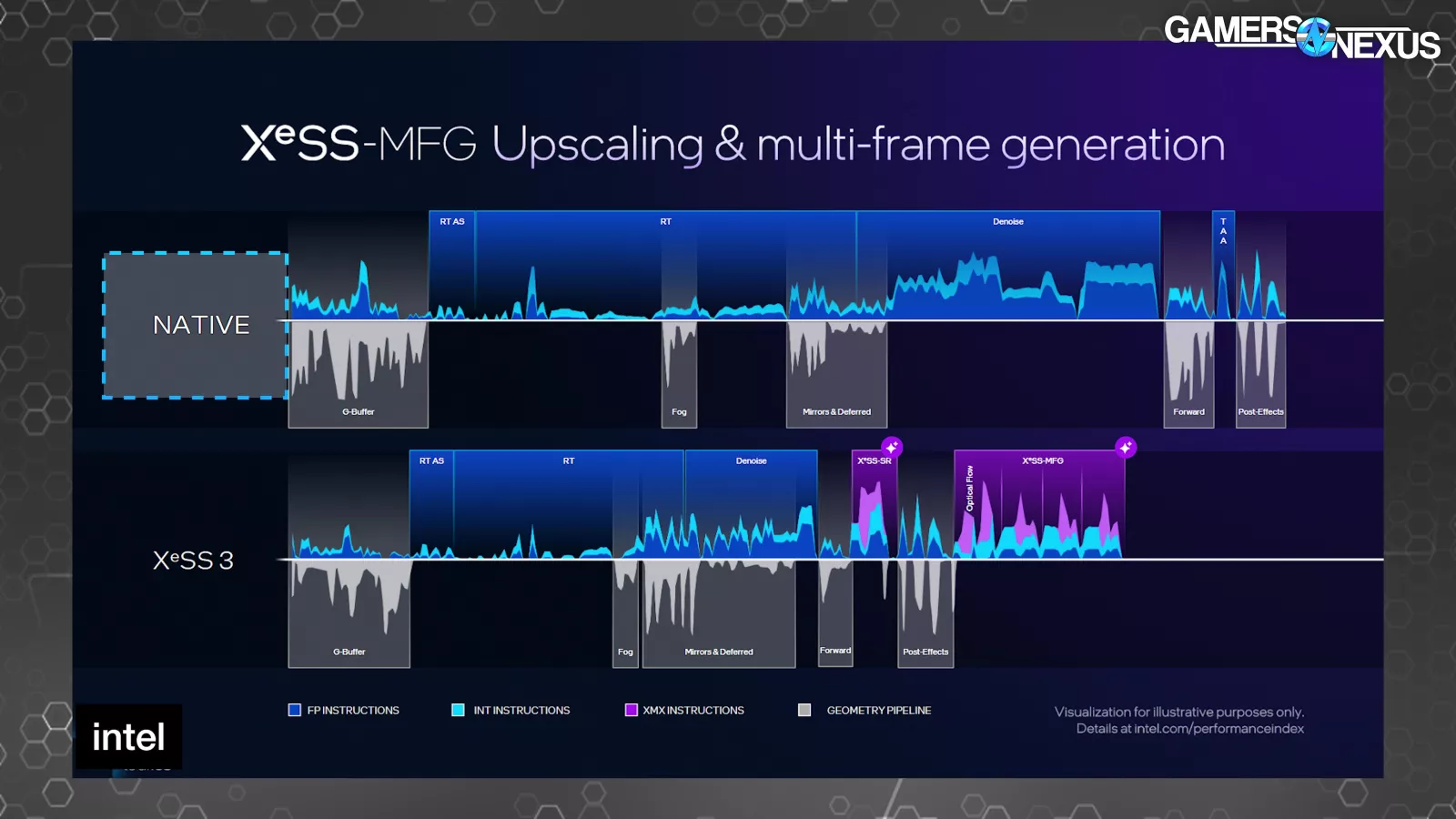 Intel presented a few timelines of a single frame. One at native, and then several with various levels of XeSS technology in use. The shorter the duration that the frame is on the X-axis, the less time the frame took to complete. The top half of each shows instructions and the bottom half shows when the geometry pipeline is active.