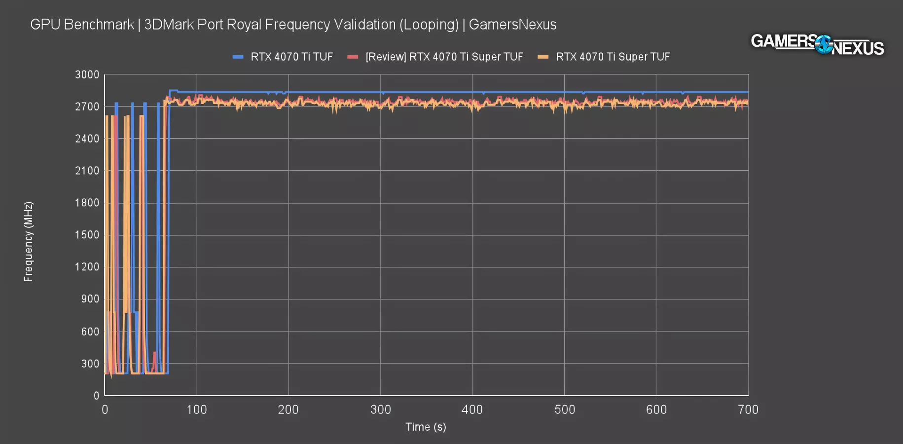 We have two identical 4070 Ti Super cards, so to help validate these, we tested both for frequency in Port Royal. The brief test established an average frequency of 2746MHz for the unit we used for our review, with the more recently tested unit that wasn’t used in the review at 2725MHz on average. This is about a 20MHz delta. That’s within manufacturing variance, but the silicon quality on the unit we chose at random appears to be a little higher than the secondary model that we used for future latency testing.
