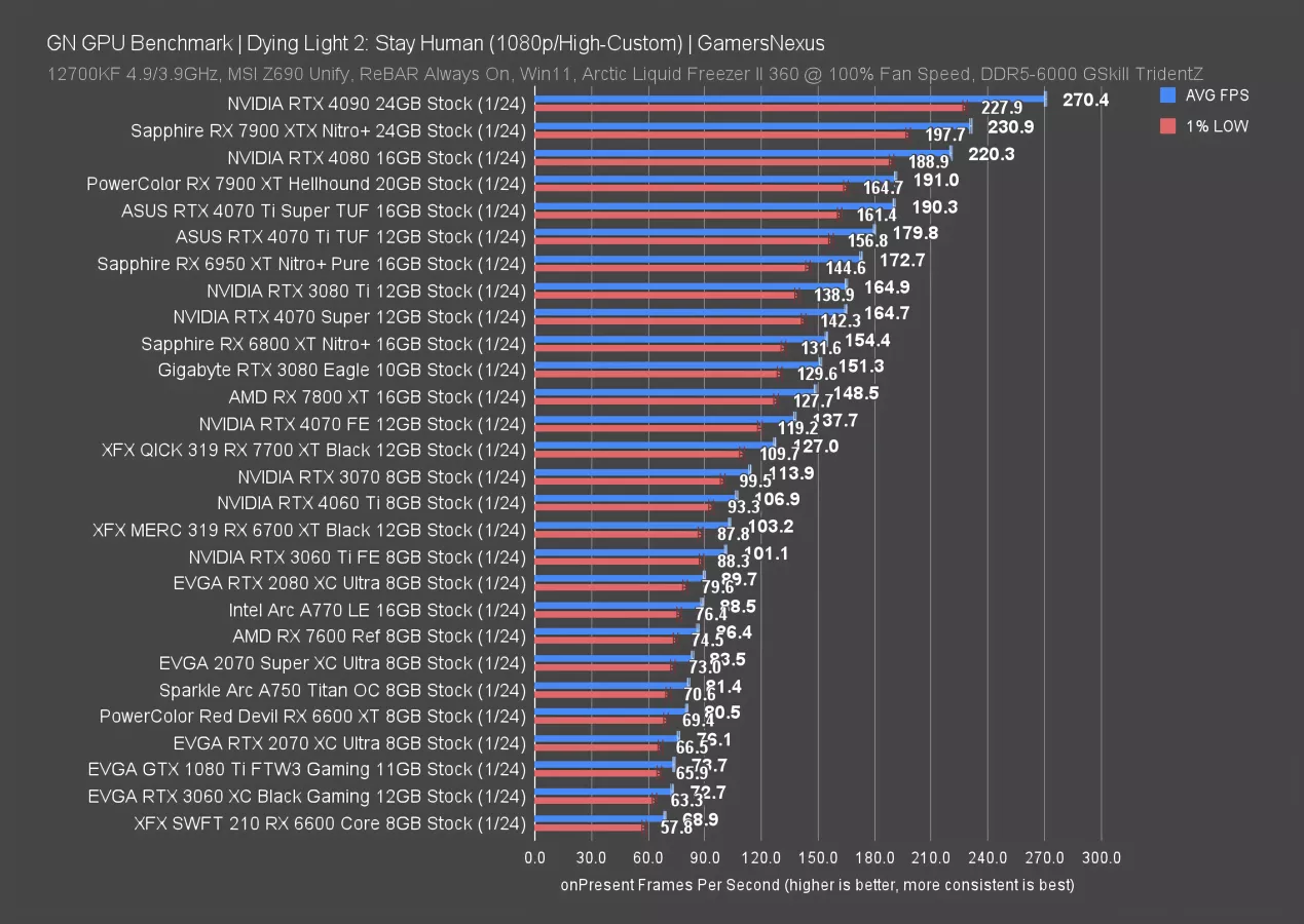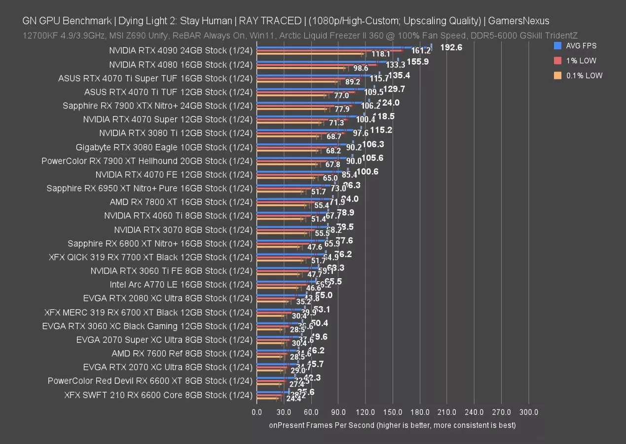 The 4070 Ti Super ran at 129FPS AVG here, establishing a 15FPS lead over the 4070 Ti, or about 12.5%. The 7900 XT sits close to the Ti Super, but behind it -- and AMD has worse 0.1% lows in this game than would be proportional to the average.