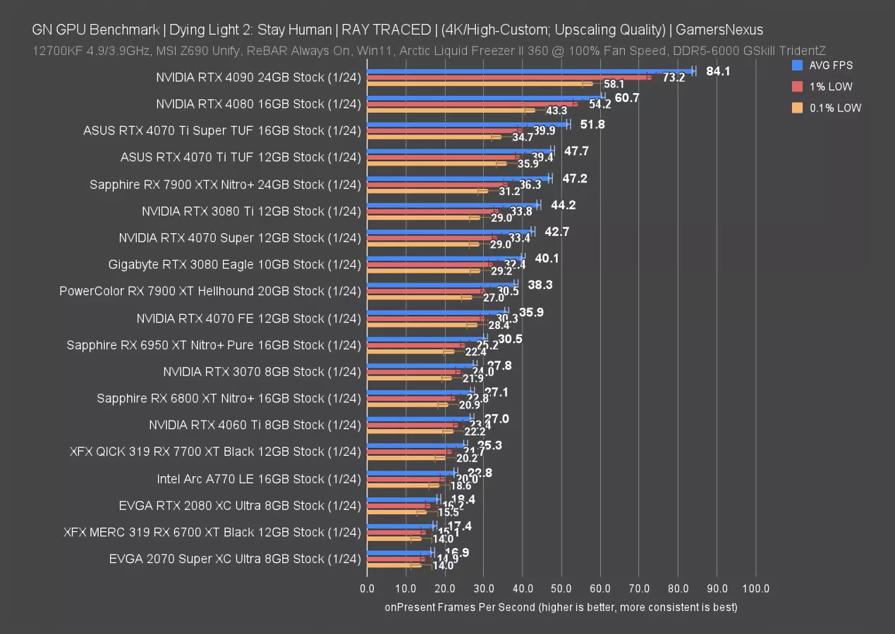 Dying Light 2 is a 2022 game. Tested at 4K first, the 4070 Ti Super leads the 4070 Ti by 12.6%, better than we saw in the last game. The 7900 XT is about equal with the 4070 Ti Super and can’t be told apart at a functional level.