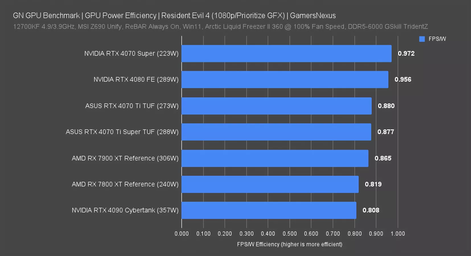 Compared to the 7900 XT, the 4070 Ti Super is about 4% more efficient in FPS/W.