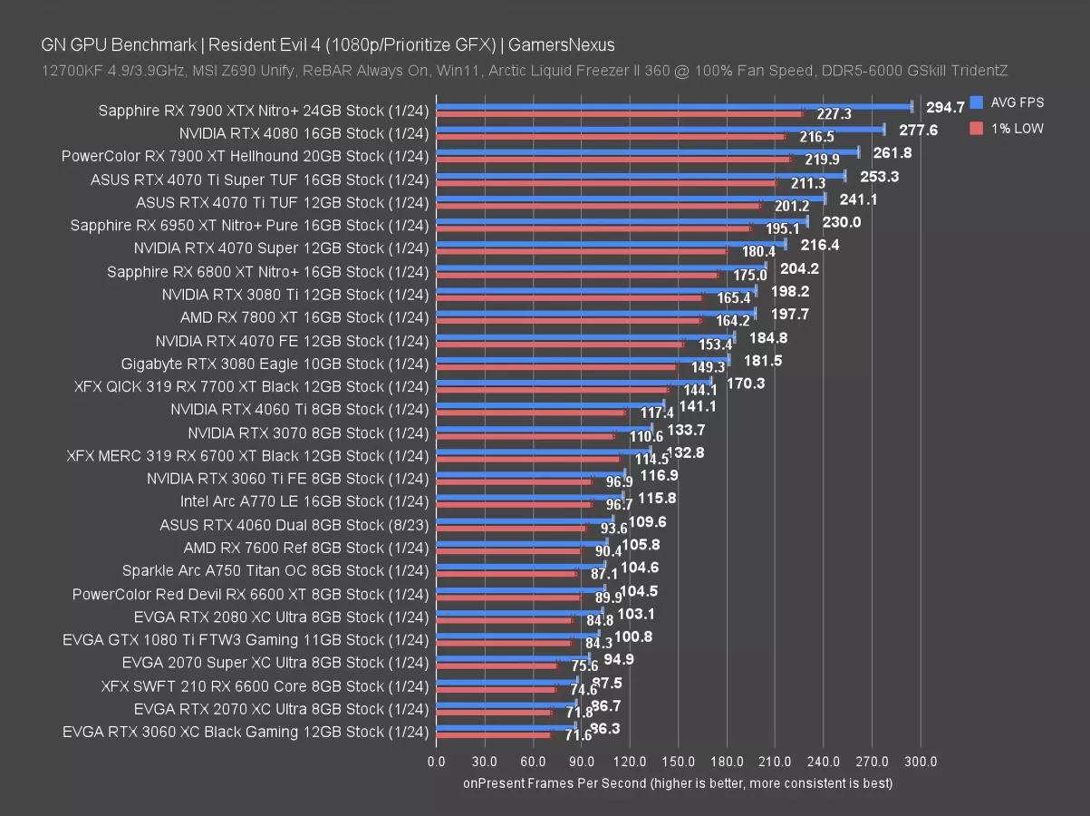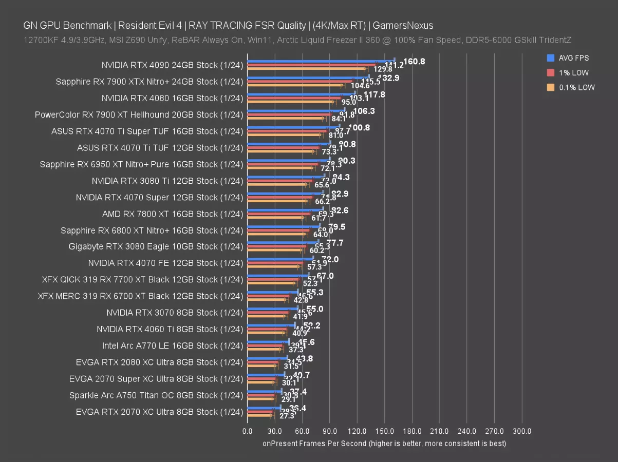 Finally for Resident Evil RT, 1080p has the 4070 Ti Super at 201 FPS AVG with FSR, reducing the lead over the Ti to 5.7%. The 7900 XT sits between the two of them and is closer to the original 4070 Ti than the 4070 Ti Super.
