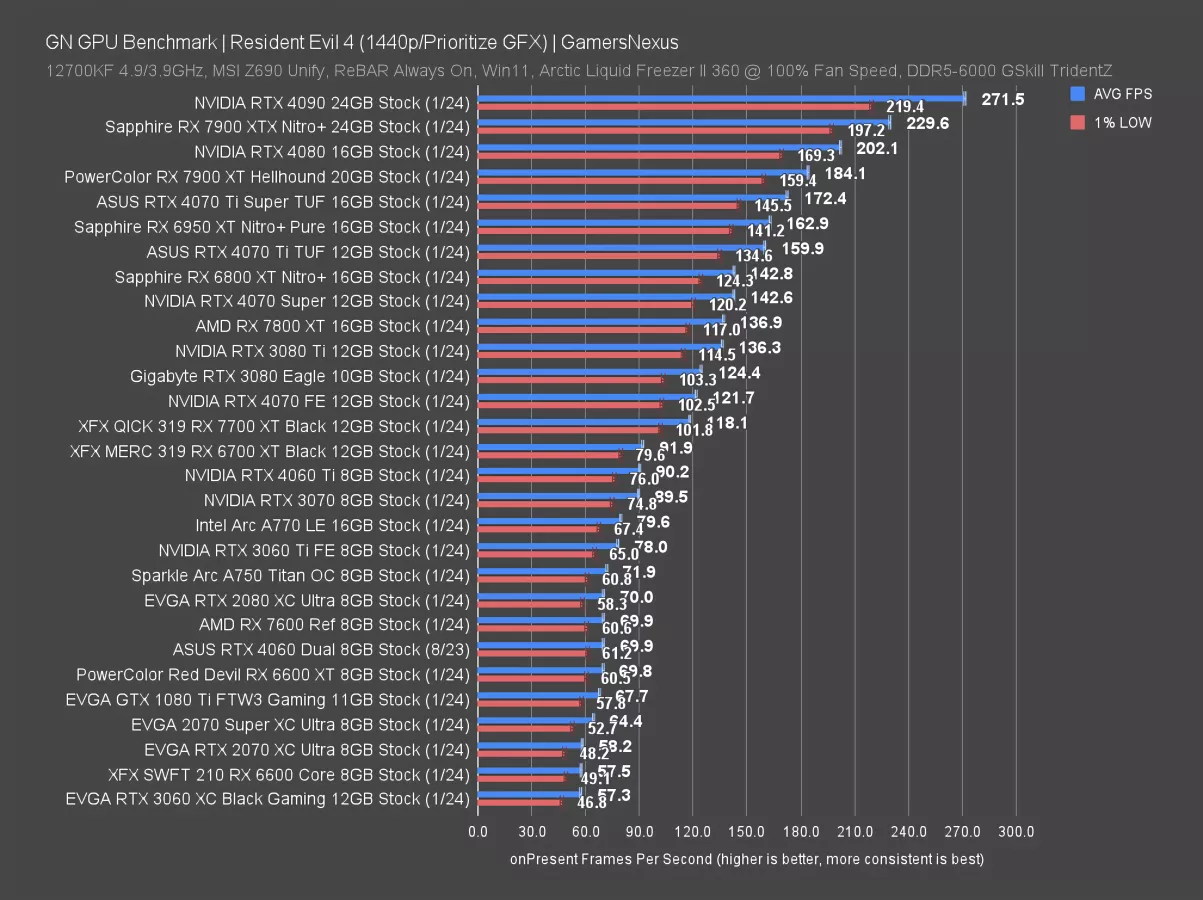 Scaling is clean at 1440p. Lows are proportional, so since the 0.1% lows don’t indicate anything noteworthy here, we’ve removed them to instead accommodate more GPUs on this chart. That’s the trade-off.