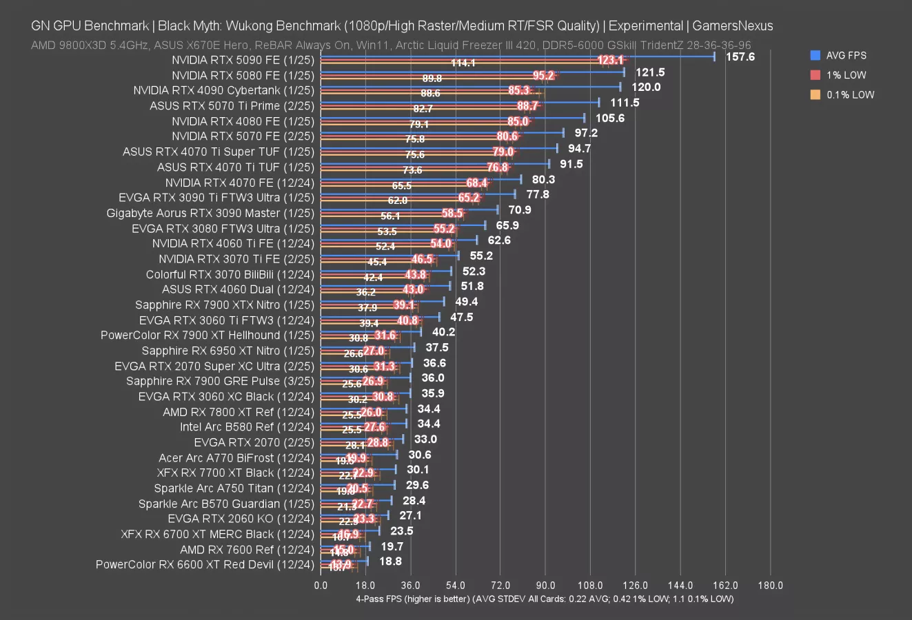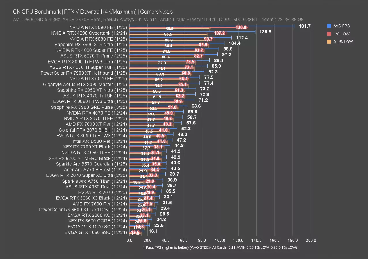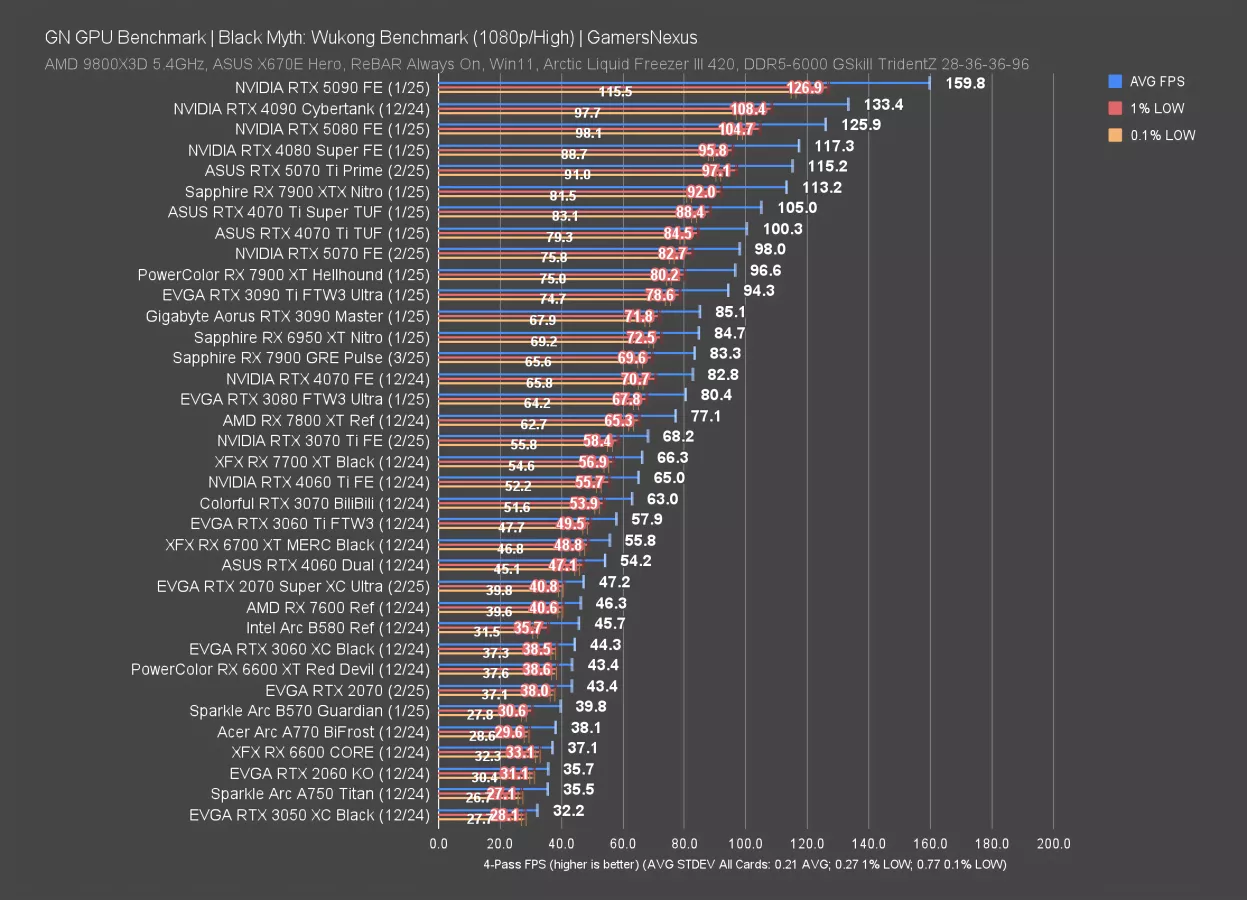 1080p reintroduces other 70-class cards: The 5070 Ti ran at 167 FPS AVG, with the 5070 at 138. That’s still 21%. The 4070 hasn’t been rerun here yet, but the 3070 is present at 85 FPS, yielding a 62% lead to the 5070, followed by the 2070 at 60 FPS for 130%, then the GTX 1070 at 35 FPS AVG. That’s about a 293% improvement to the 5070.