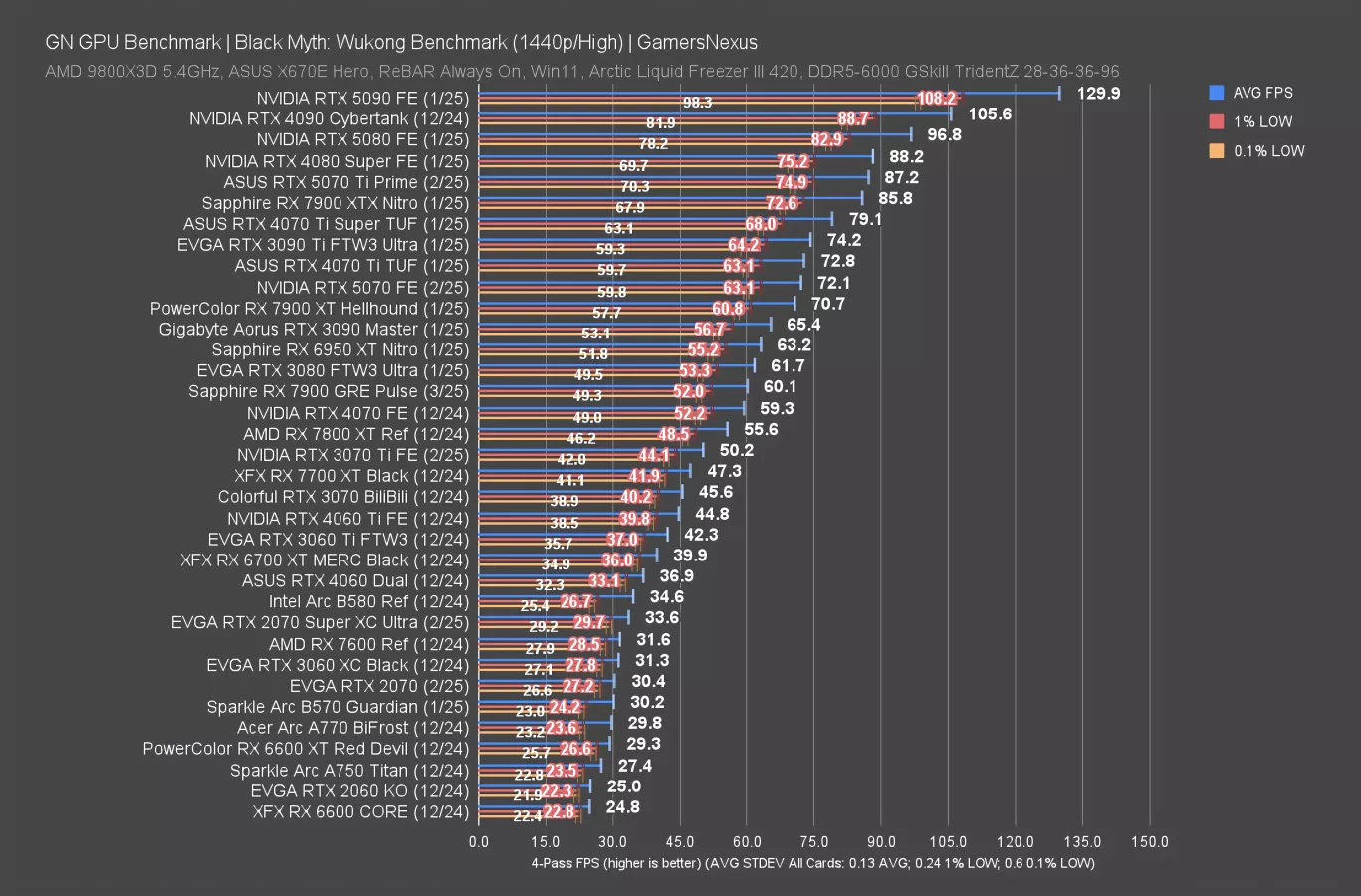 At 1440p, the 5070 Ti ran at 88 FPS AVG, the 5070 at 73 FPS AVG (between the 4070 Ti and 4070 Ti Super), and the original RTX 70-class card ran at 24 FPS AVG. AMD’s best here, as of today and not tomorrow, is the 7900 XTX at 37 FPS AVG.