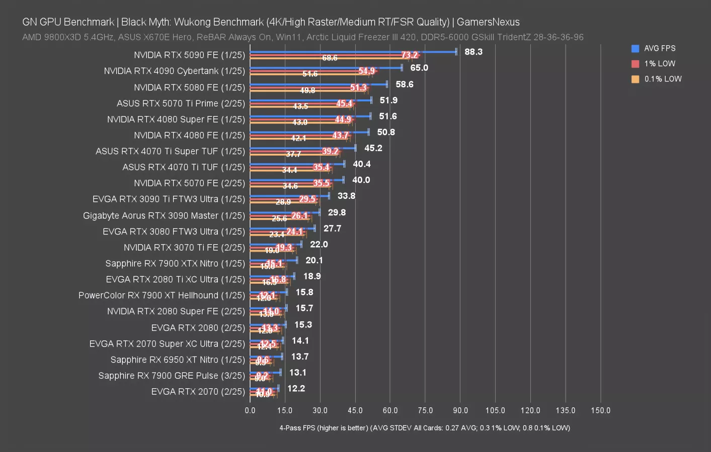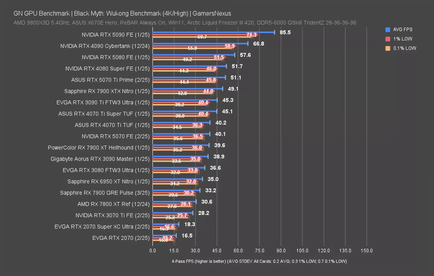Black Myth: Wukong at 4K and rasterized had the 5070 at 40 FPS AVG, giving the 5070 Ti a 27% lead. The 5070 really struggled in this one and ended up tied with the 4070 Ti and, to its benefit, the 7900 XT. We’ll be curious to see how the 9070 does in this one… Surely we don’t already know as we’re writing this and definitely haven’t looked at the results and in no way would we ever encourage you to just wait and see what the results are…