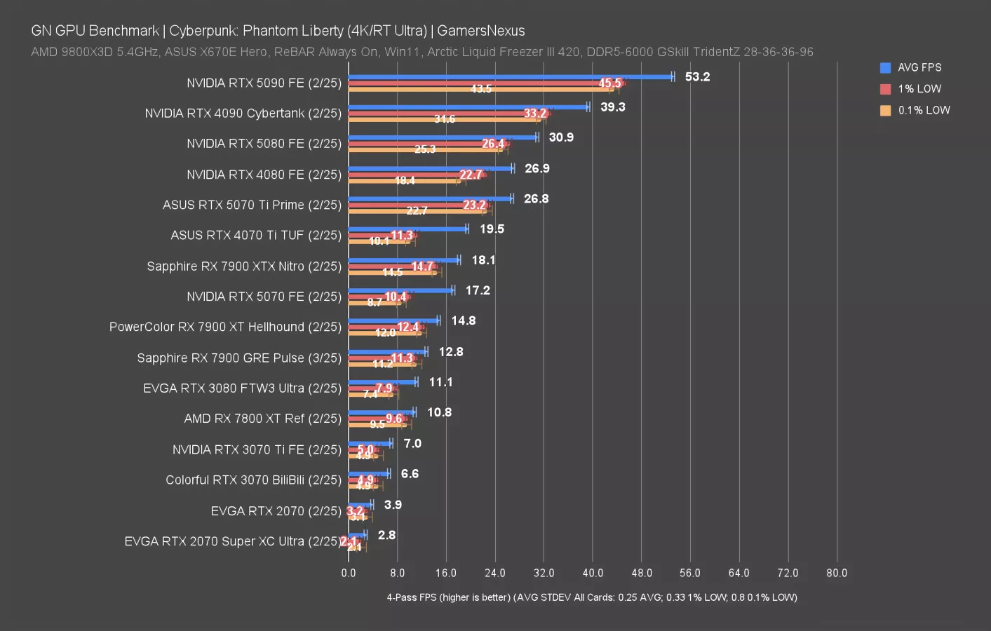 The RTX 5070 ran at 56 FPS AVG here and had good frametime pacing represented in the lows, but then again, so did everything around it. It’s proportional.