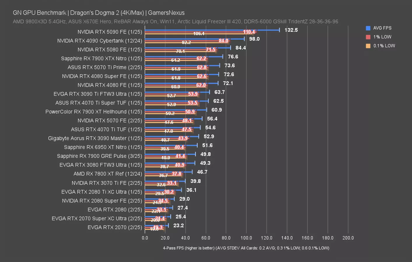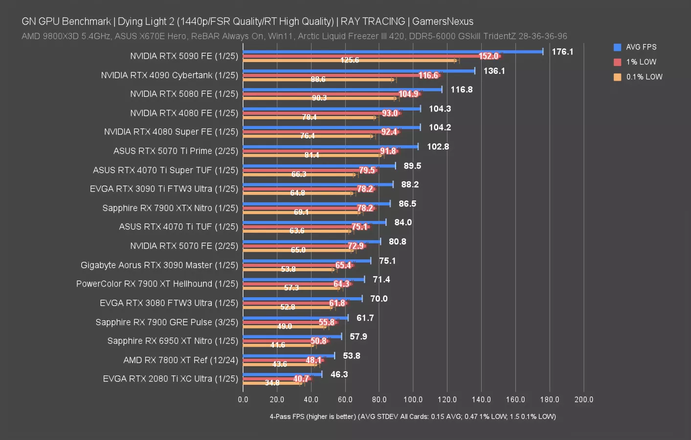 At 1080p, the 5070’s 126 FPS AVG has it just behind the 4070 Ti. The 7900 XT leads by only 7% here, with the 5070 Ti knocked down to a 21% lead from 25% at 1440p. The 5070 Ti’s 151 FPS AVG is also about the same as the 7900 XTX, which has its own slight advantage.