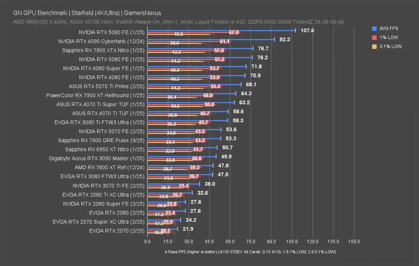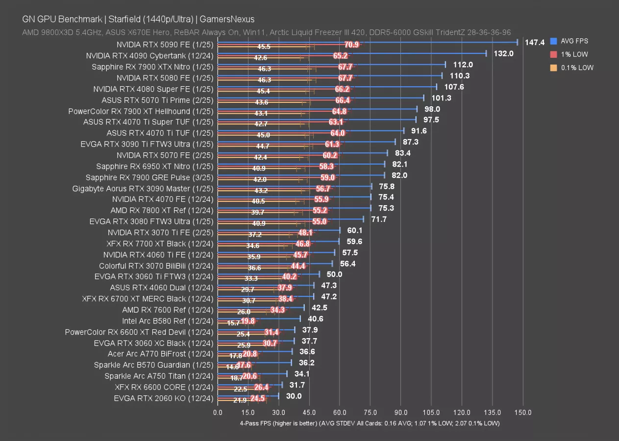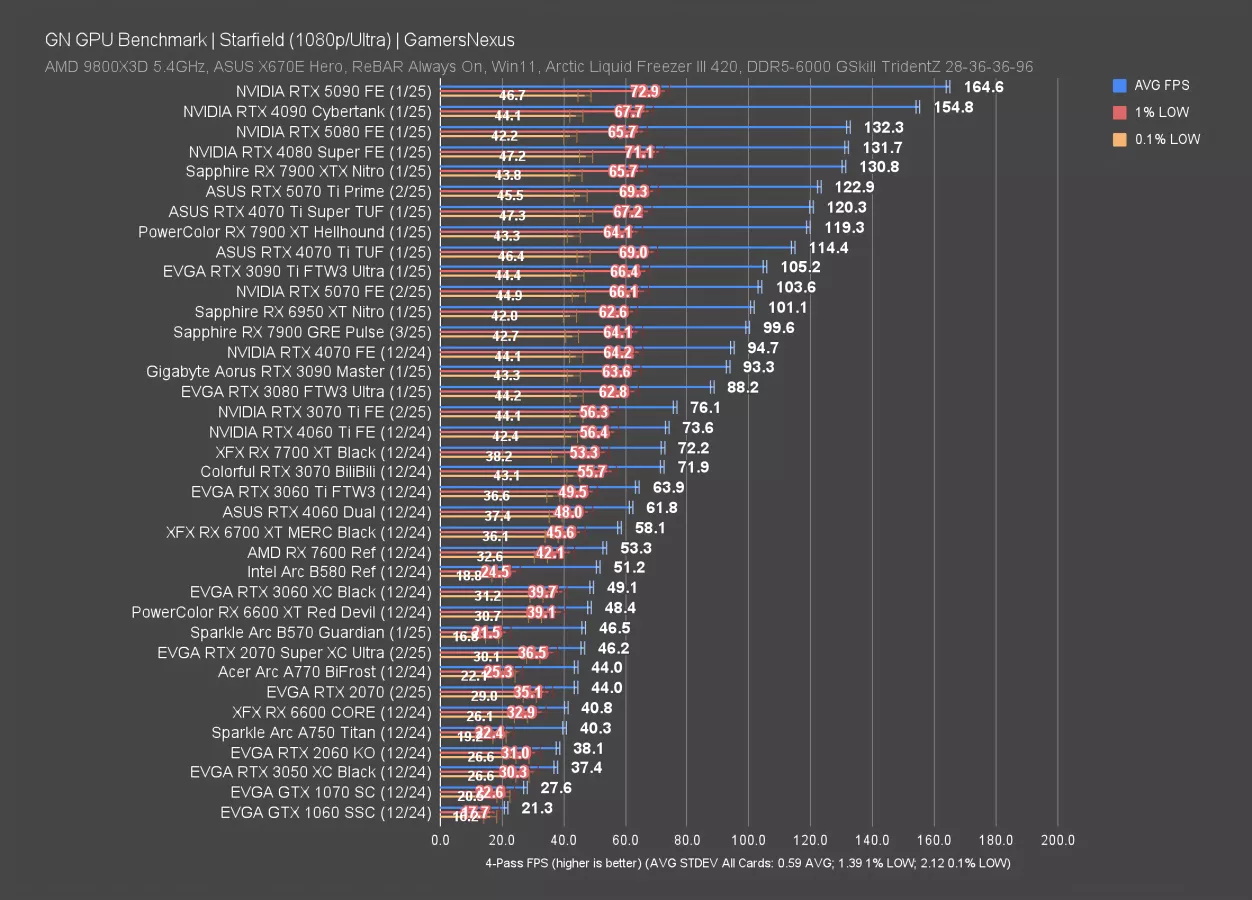 Starfield at 4K is up now. The RTX 5070 ran at 54 FPS AVG here, giving the 4070 Ti’s 59 FPS a 9% lead. It’d be interesting if AMD’s 9070 performed similarly to the 7900 XT here since the Hellhound is 20% ahead of the 5070. We’ll find out tomorrow.