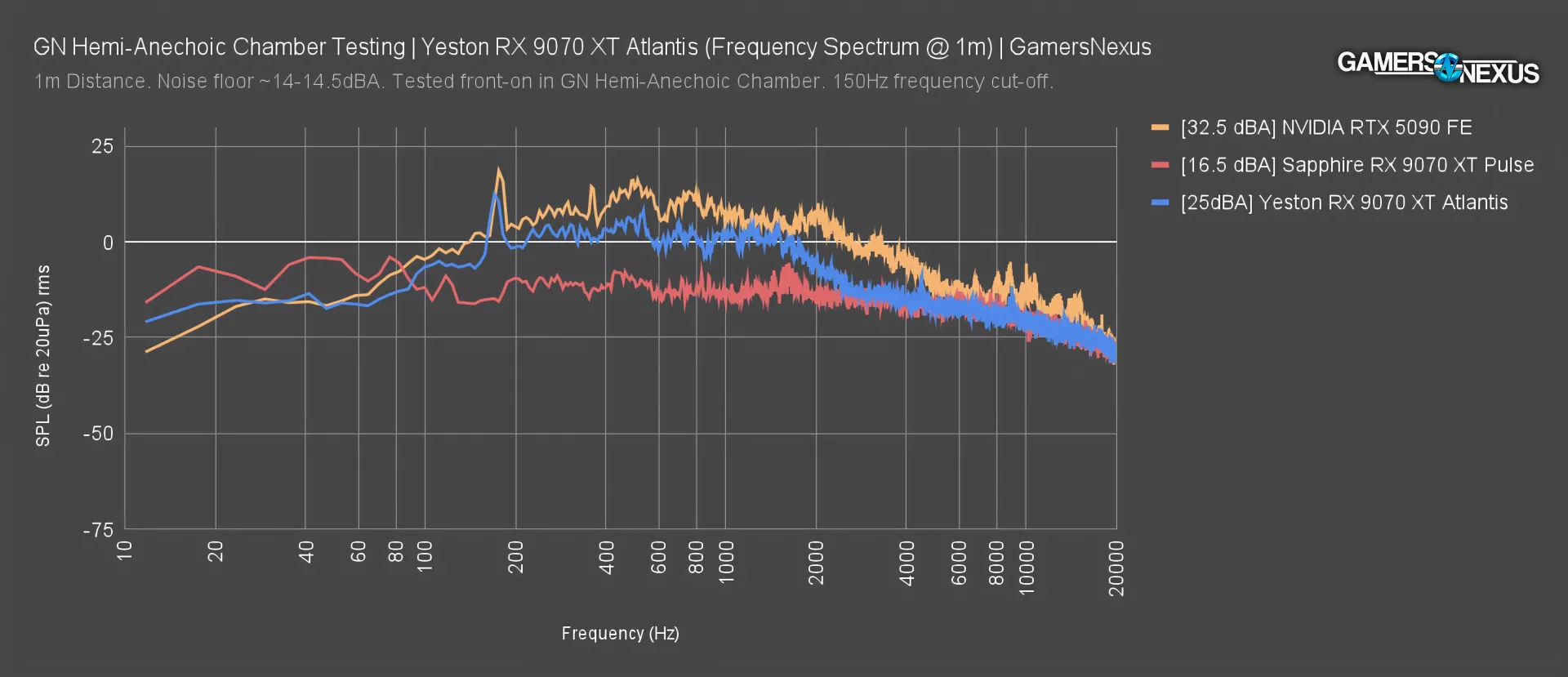 The 9070 XT Pulse from Sapphire ran quieter than the Yeston 9070 XT Atlantis overall, which is also reflected in this incredibly flat frequency spectrum plot. We’re too close to the noise floor for good readings here. Once we buy our new microphone equipment, we’ll be able to drop the floor closer to 6 dBA. For now, the Pulse’s VBIOS temperature target results in a low noise level.