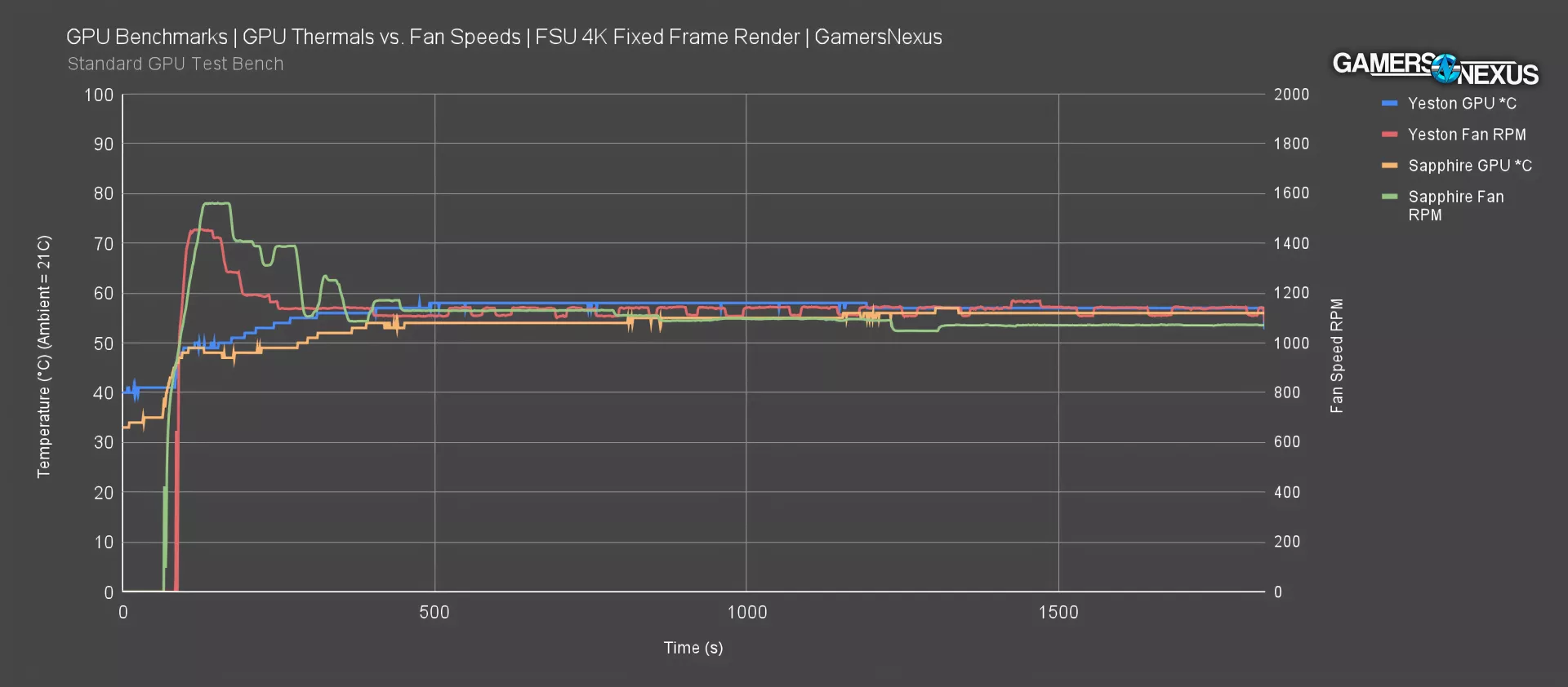 This plot of temperature at equilibrium compares the Yeston card against the Sapphire Pulse XT that we already reviewed and recently did a tear down on. We’ll keep adding to this.