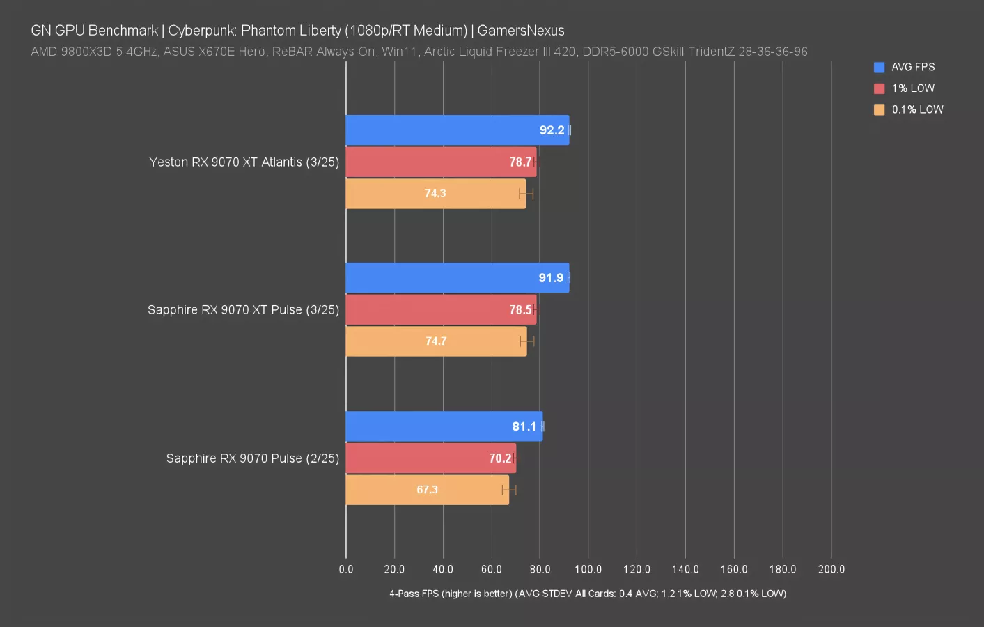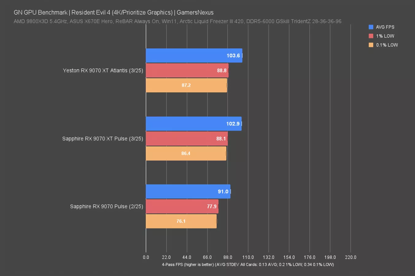 In Resident Evil 4 at 1440p, the 9070 XT Atlantis outperformed the 9070 XT Pulse on a pure technicality: We’re seeing about a 1 FPS advantage for the Yeston card.